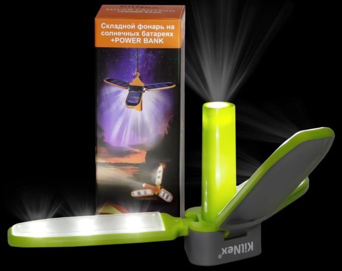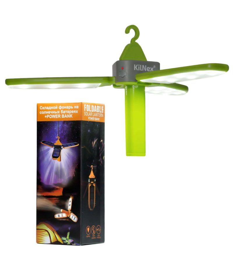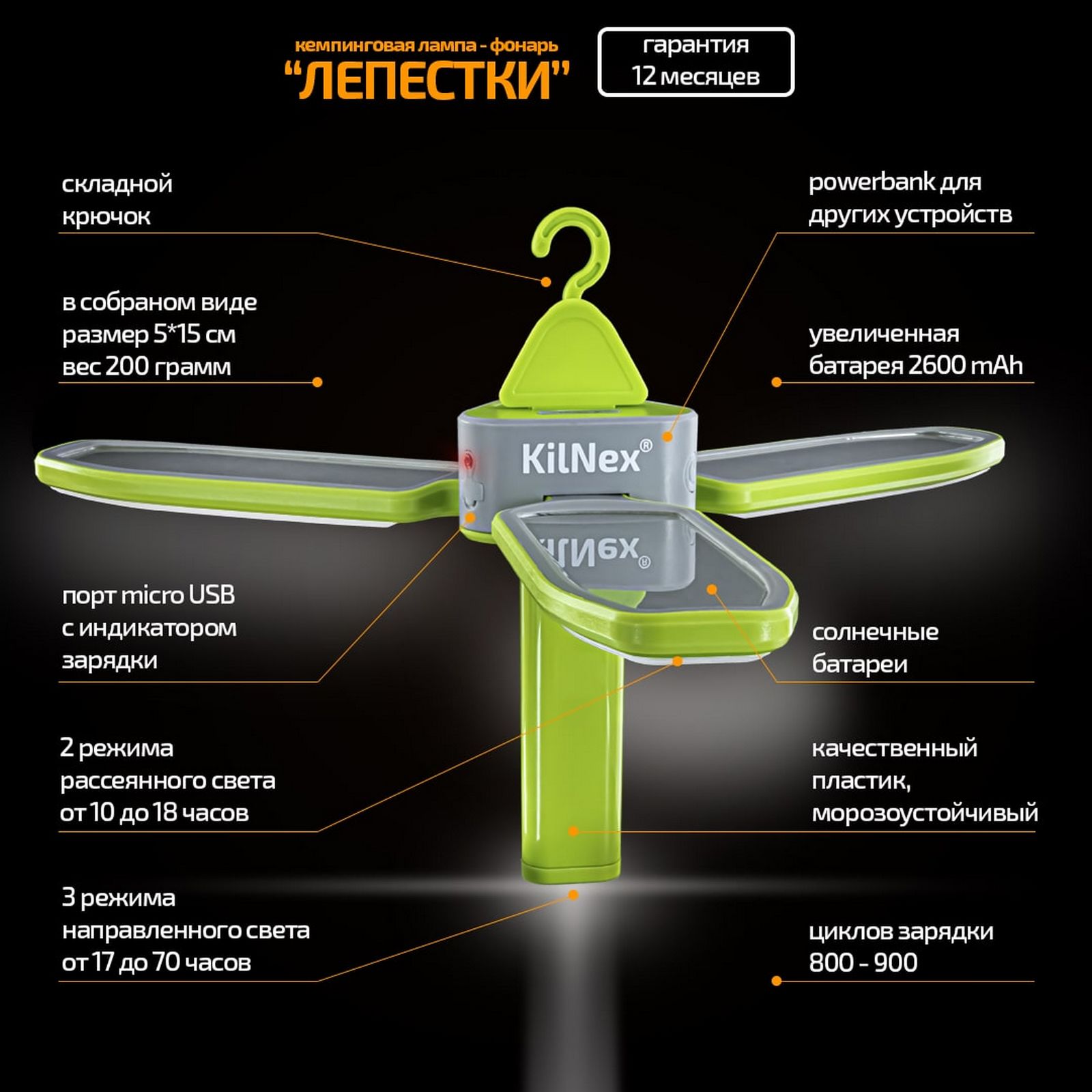 Фонарь Kilnex, это комбинированный складной на солнечных батареях и аккумуляторе светодиодный ручной фонарь "Луч" направленного - лампа "Лепестки" рассеянного освещения. Прочная и водостойкая конструкция, литий-ионная батарея -она же powerbank, емкостью 2600 mAh с USB зарядкой. Это идеальная комбинация фонаря и лампы, лучший выбор для дачи, кемпинга, туристов и просто отдыхающих на природе.