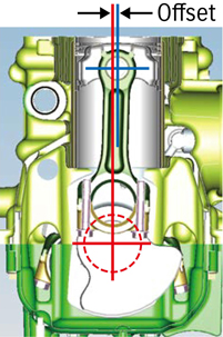 Размещение коленчатого вала в положении, несколько смещенном от центра цилиндра, позволяет снизить давление на боковую стенку цилиндра во время движения поршня вверх и вниз внутри цилиндра. Как результат движение движение поршня становится более плавным, что способствует улучшению эффективности работы мотора в целом.