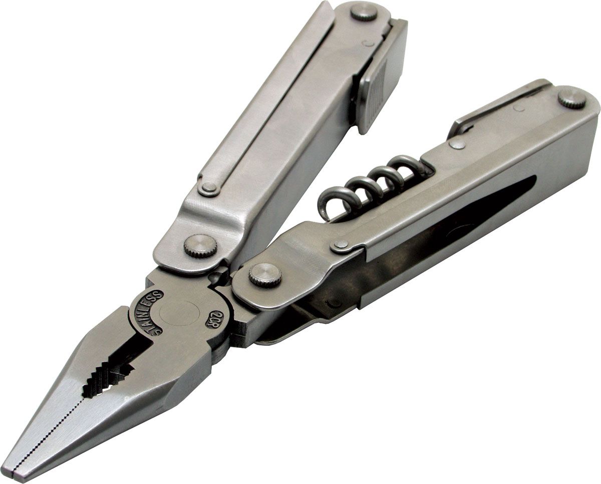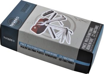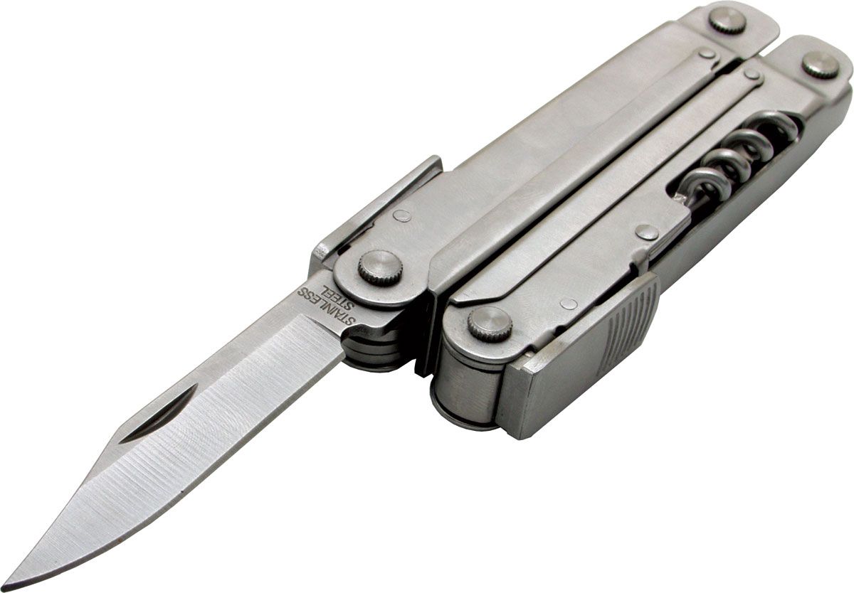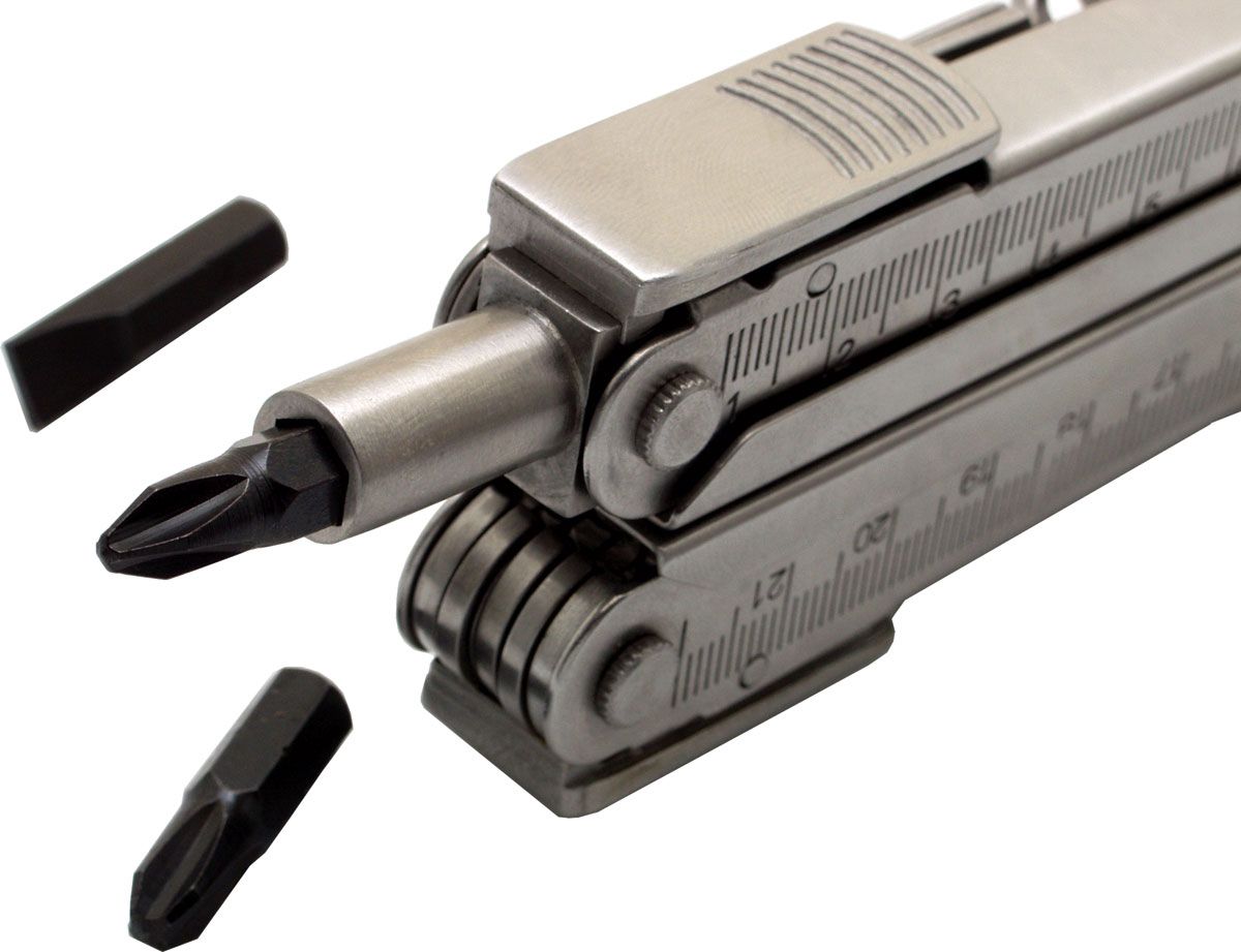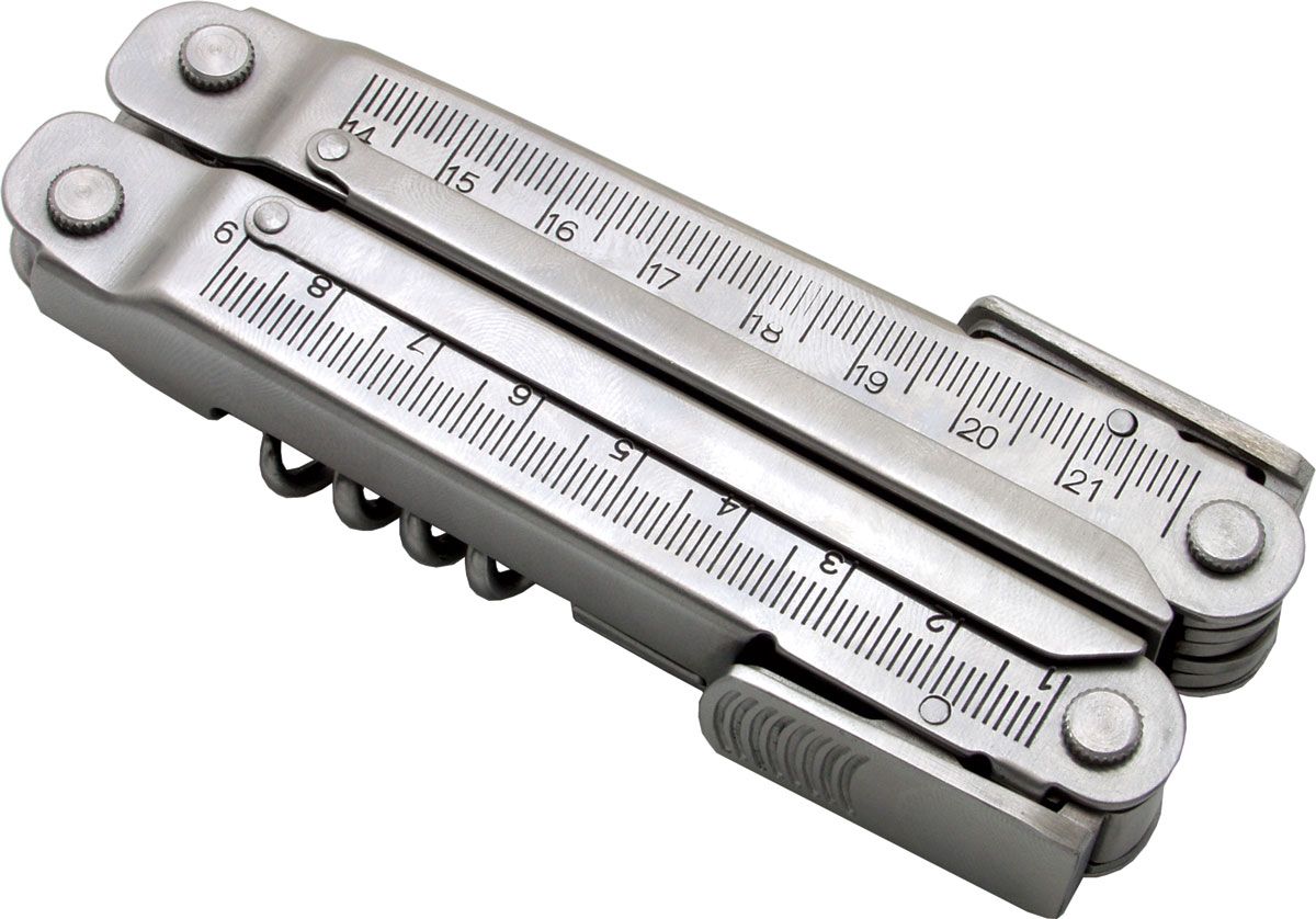 22 функции: универсальные плоскогубцы / кусачки / кусачки для проволоки / нож / консервный нож / линейка / дырокол / пила / штопор / продеватель нити / отвертки с плоским жалом , 3 размера / отвертки Philips, 4 размера / шестигранники, 5 размеров.