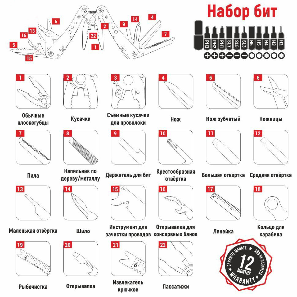 Размер инструмента - 10,5x5см. Толщина - 1,5 см. При этом комплектность мультитула составляет 22 инструмента, что делает его многофункциональным и при этом по-настоящему эргономичным.