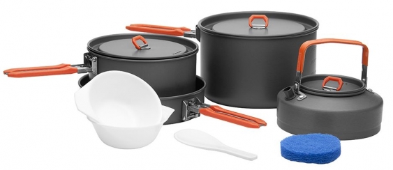 Туристический набор посуды для 4-5 человек Fire Maple Feast 4 из анодированного алюминия. Комплект включает в себя 1 сковороду емкостью 1,0 литр, которая одновременно может служить миской. Два котелка емкостью 1,7 и 2,7 литра с крышками, которые имеют стравливающие пар / сливные отверстия и удобные ручки из термопластика. Плюс 2 пластиковых чашки и 1 лопатка. Чайник объемом 0,8 литра с ситечком. Каждый алюминевый элемент набора оборудован складными съемными фиксируемыми рукоятками с покрытием из термопластика. Рукоятка складываясь фиксирует крышку на котелке. Котелки по диаметру позволяют поместить в себя стандартный резьбовой баллон.