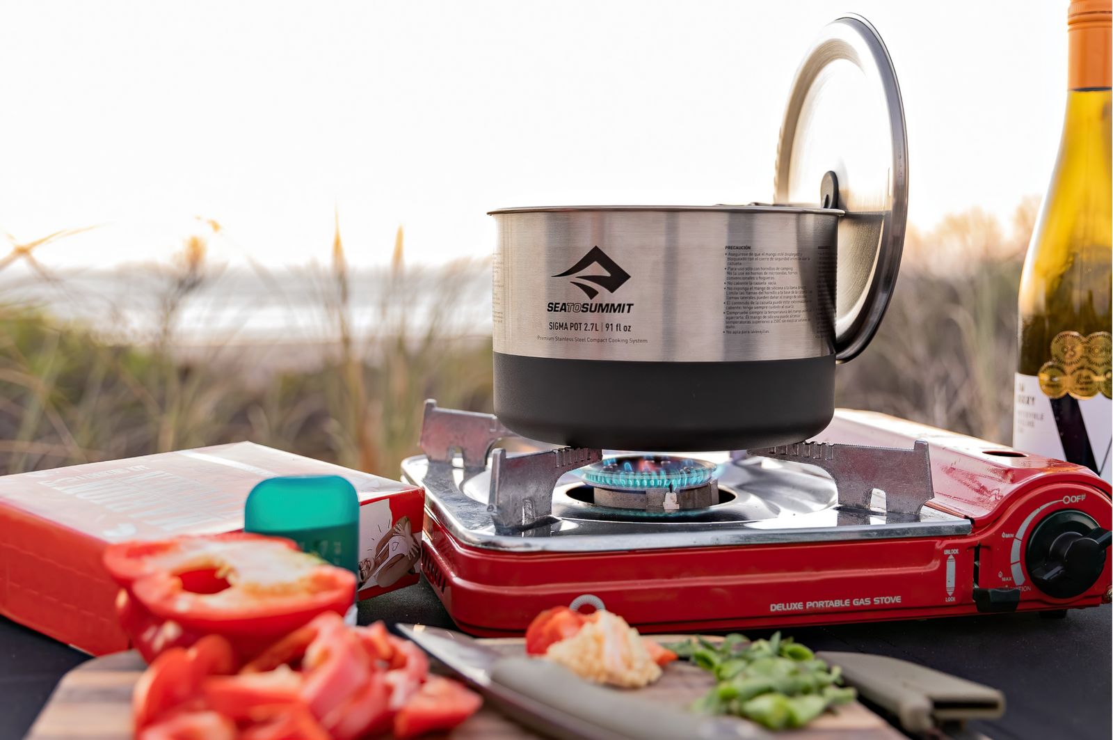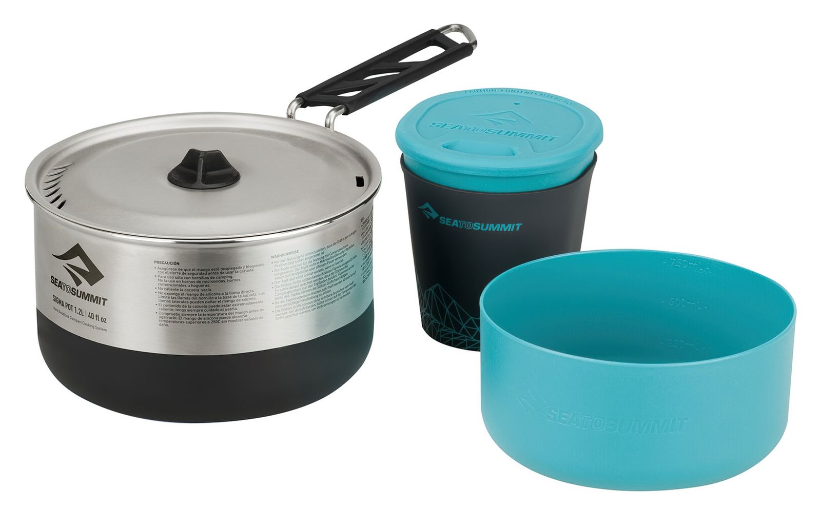 Набор посуды Sea To Summit Sigma™ CookSet 1.1 состоит из котелка объемом 1,2 литра, миски DeltaLight™ объемом 750 мл и кружки DeltaLight™ объемом 350 мл. Он идеально подходит для одиночных приключений и представляет собой непревзойденный легкий кухонный гарнитур для туриста, который поможет вам приготовить кулинарные изыски в походе. Изготовленный из морской нержавеющей стали премиум-класса, отличается прочностью, легкостью и предлагает прочную, стойкую к истиранию и легко очищаемую поверхность для приготовления пищи на вашей походной кухне. Мы внедрили некоторые умные технологии, такие как складная рукоятка Pivot-Lock™, которая надежно фиксируется на месте во время использования и запирается для транспортировки, силиконовая ручка Lid Keep™, которая удерживает крышку сбоку от котелка, а не на земле во время готовки, и уникальный рисунок ситечка с прорезями на крышке для стравливания пара и слива воды. С добавлением элементов полимерной столовой посуды Delta Light™ и возможности их соединения вы будете создавать аппетитные блюда для гурманов для каждого приема пищи на свежем воздухе.