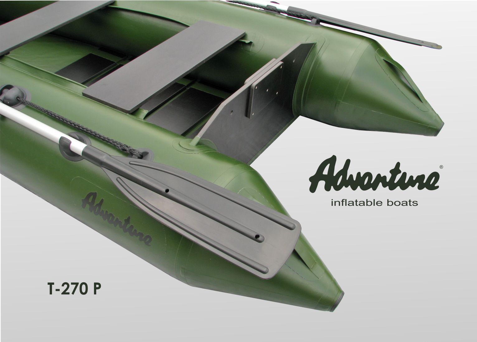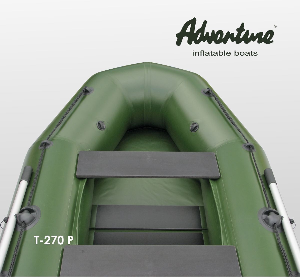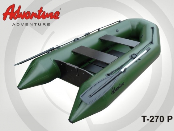 Надувная лодка Adventure T-270PN из немецкой ПВХ ткани Plastel® со сварными швами, с реечным настилом "плоскодонка" из бакелитовой фанеры толщиной 12 мм. Два независимых гермоотсека, два подвижных сиденья, 2 разборных весла с "корейского типа" уключинами, транец высотой 381 мм под максимально допустимый мотор мощностью 3,3 л.с. и весом до 26 кг.