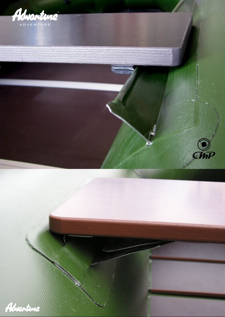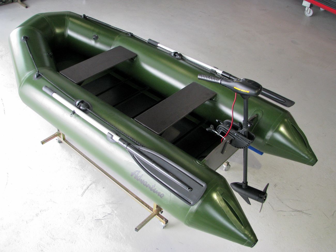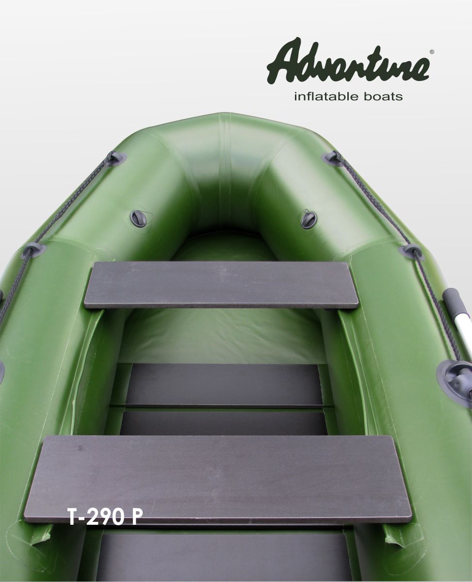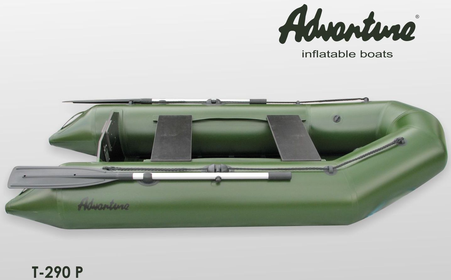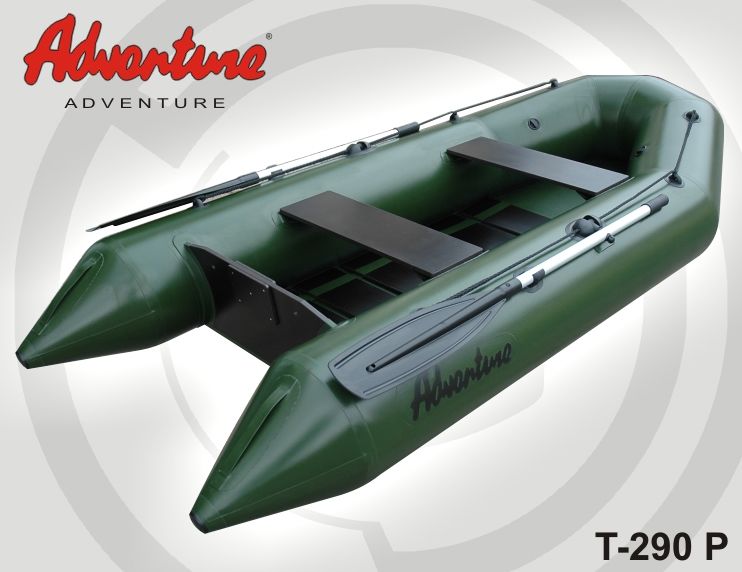 Надувная лодка Adventure T-290PN из немецкой ПВХ ткани Plastel® со сварными швами, с реечным настилом "плоскодонка" из бакелитовой фанеры толщиной 12 мм. Два независимых гермоотсека, два подвижных сиденья, 2 разборных весла с "корейского типа" уключинами, транец высотой 381 мм под максимально допустимый мотор мощностью 5 л.с. и весом до 30 кг.