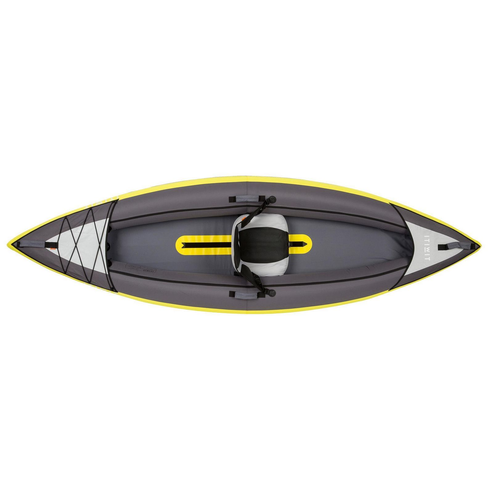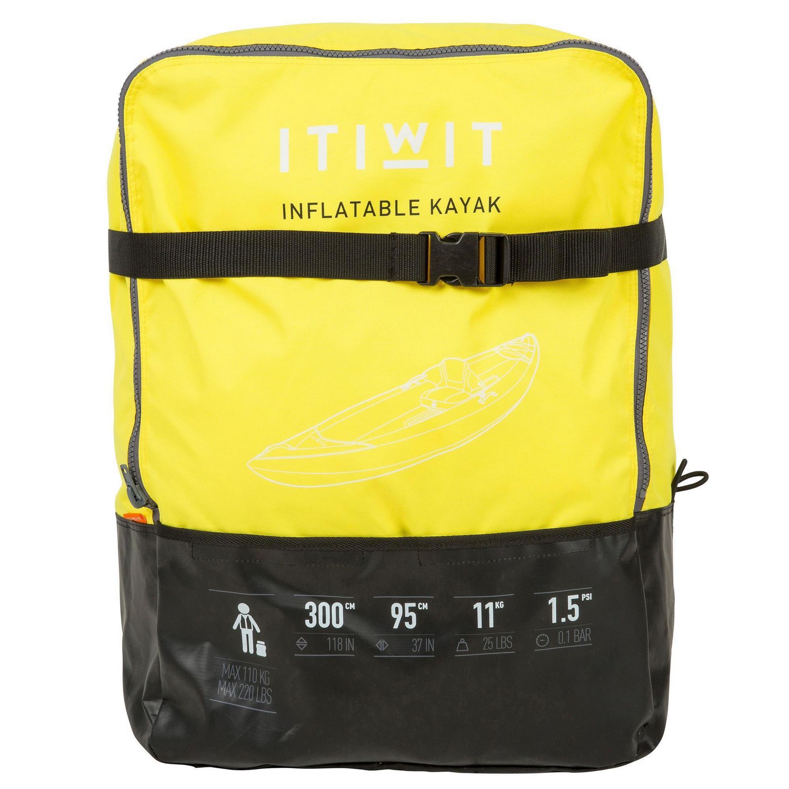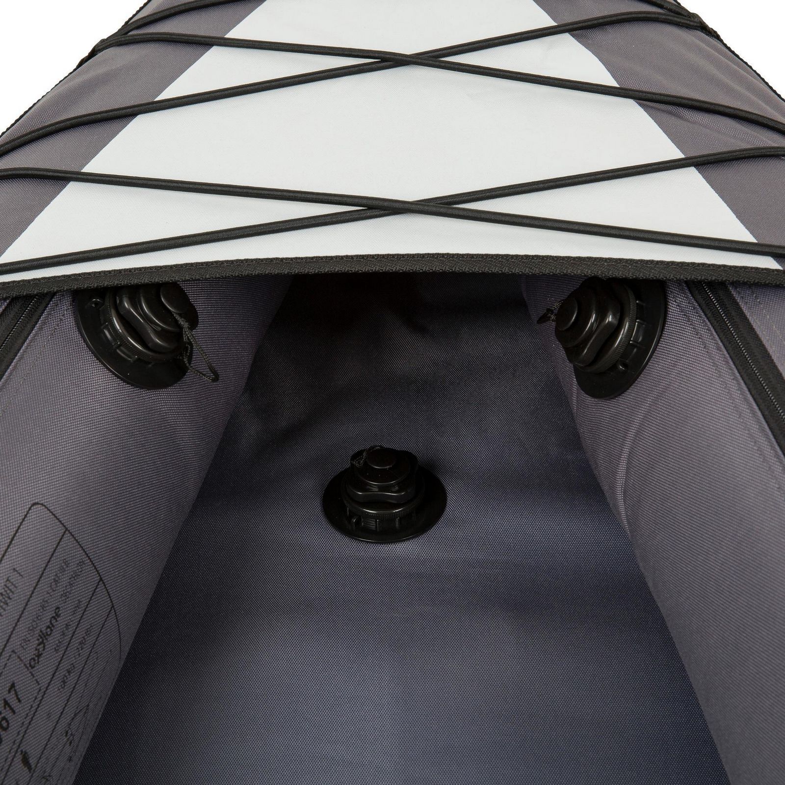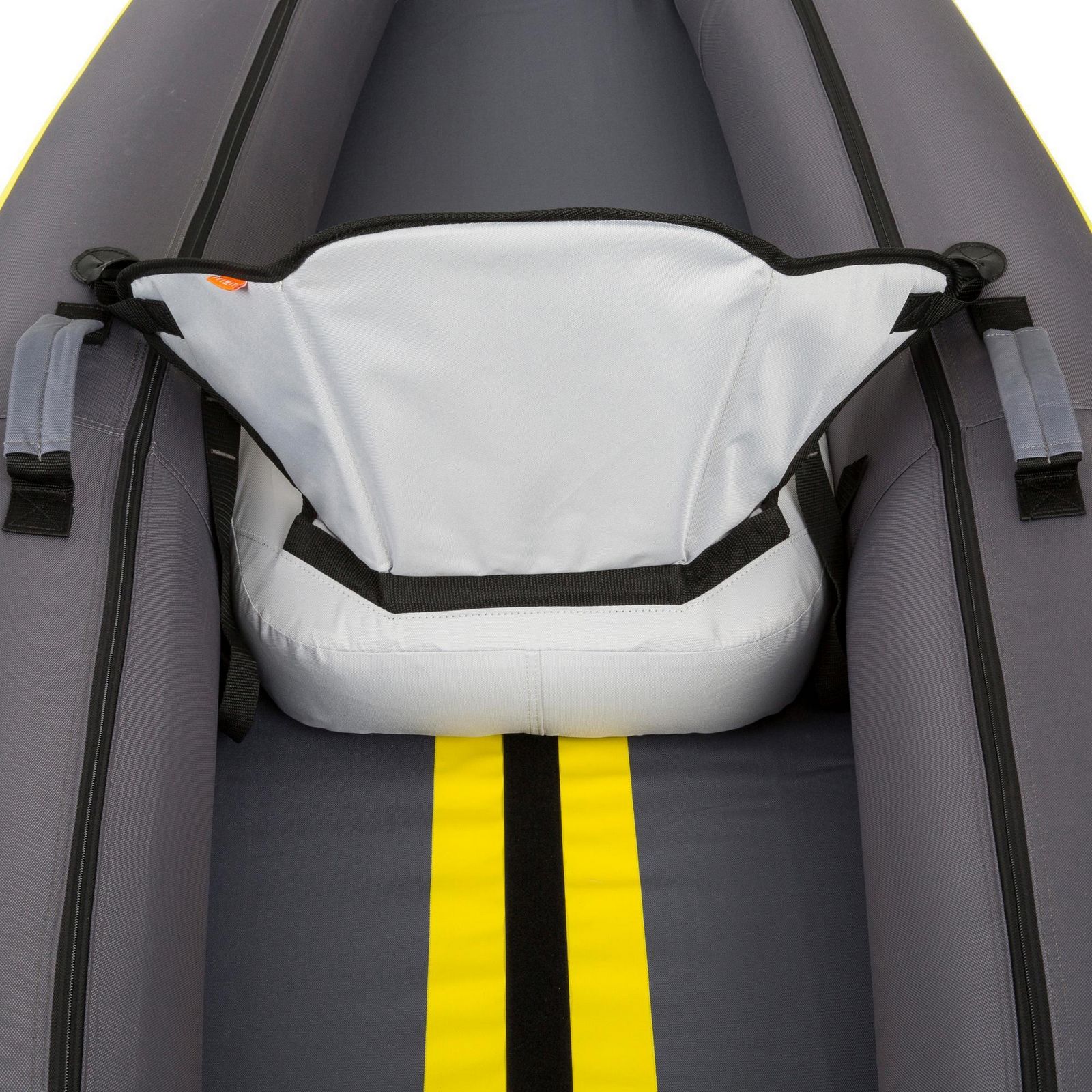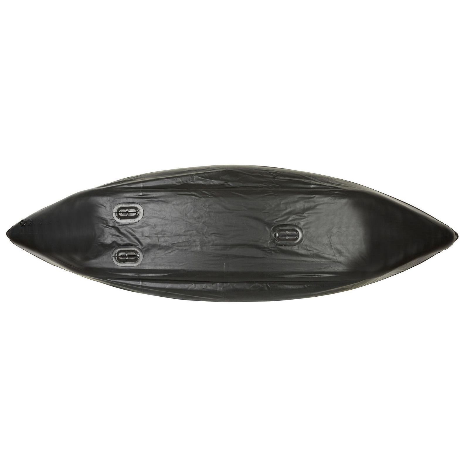 Каяк выполнен из армированной ПВХ ткани, его конструкция представляет собой: ПВХ днище и прикрепленный к нему тканевый корпус из Полиэстера, данный корпус оснащен двумя боковыми карманами на молниях вдоль всего корпуса в каждом из которых находится съемный надувной баллон, съемное надувное дно также расположено в своем отдельном тканевом чехле и вкладыввается внутрь каяка фиксируясь с помощью специального крепления.