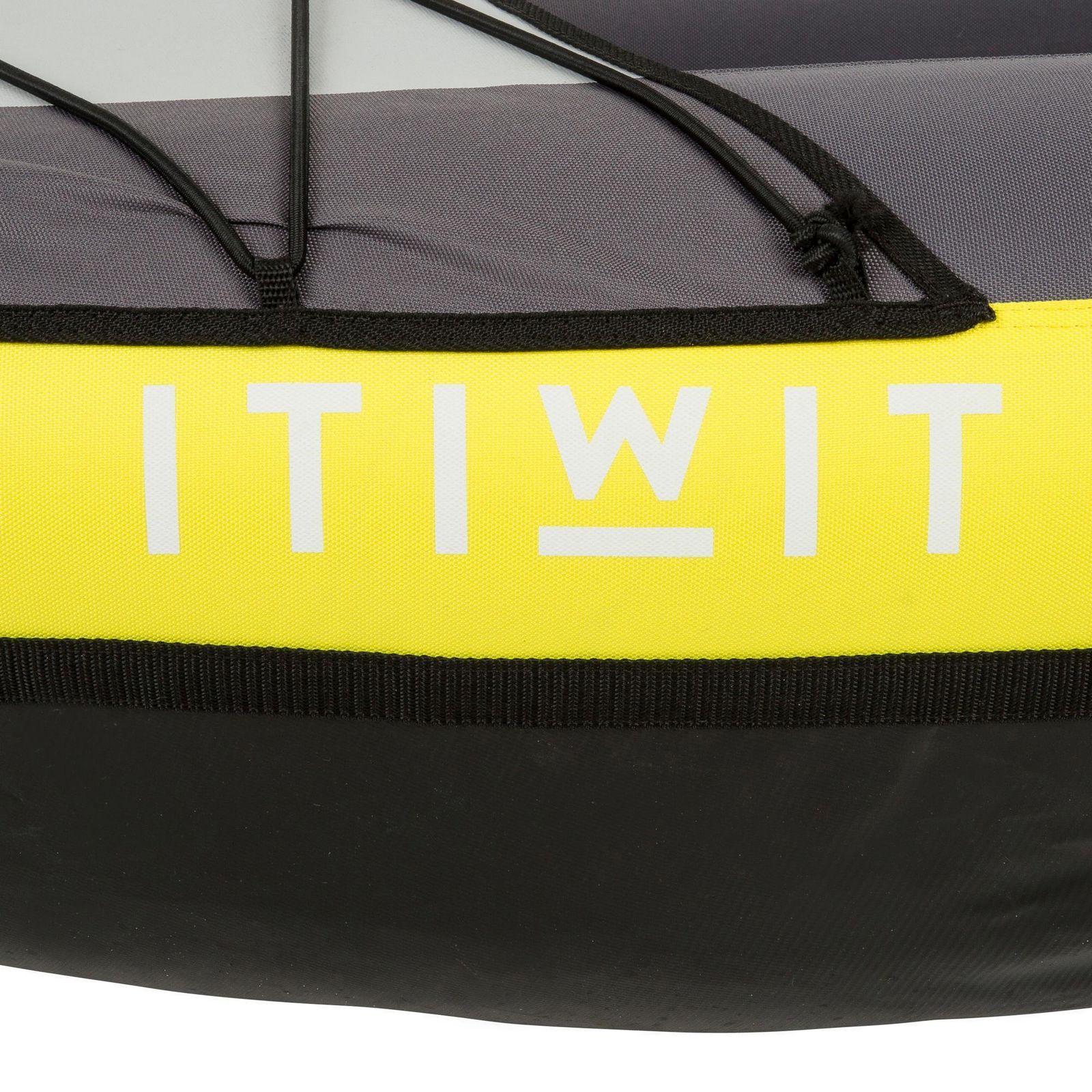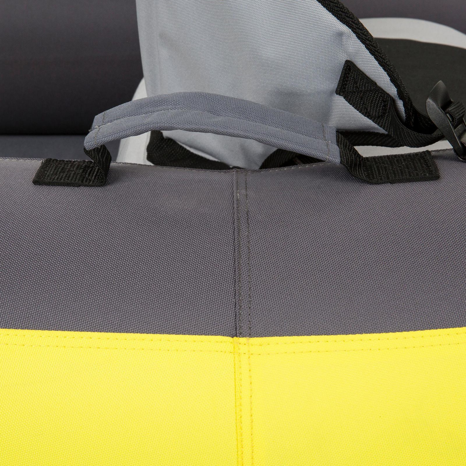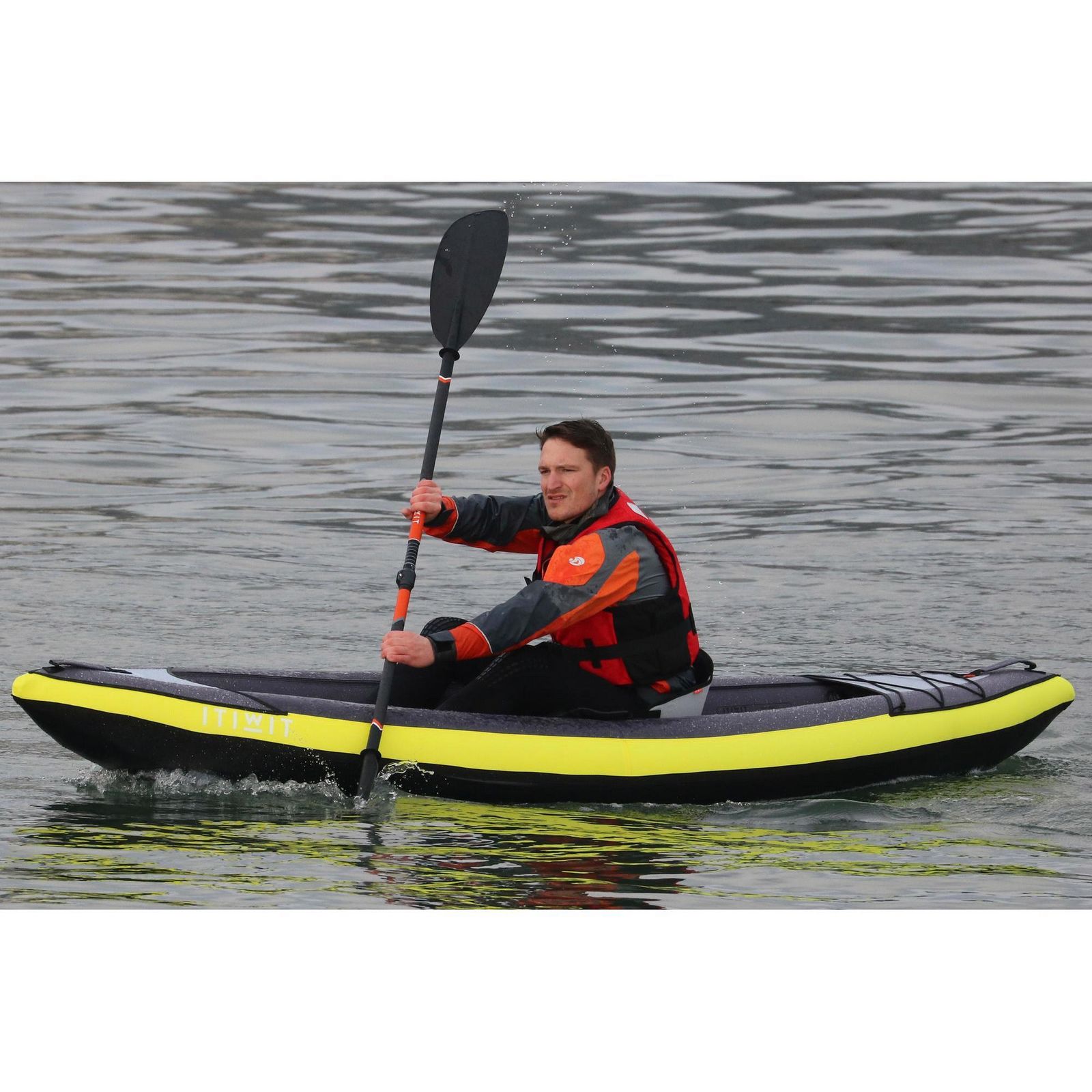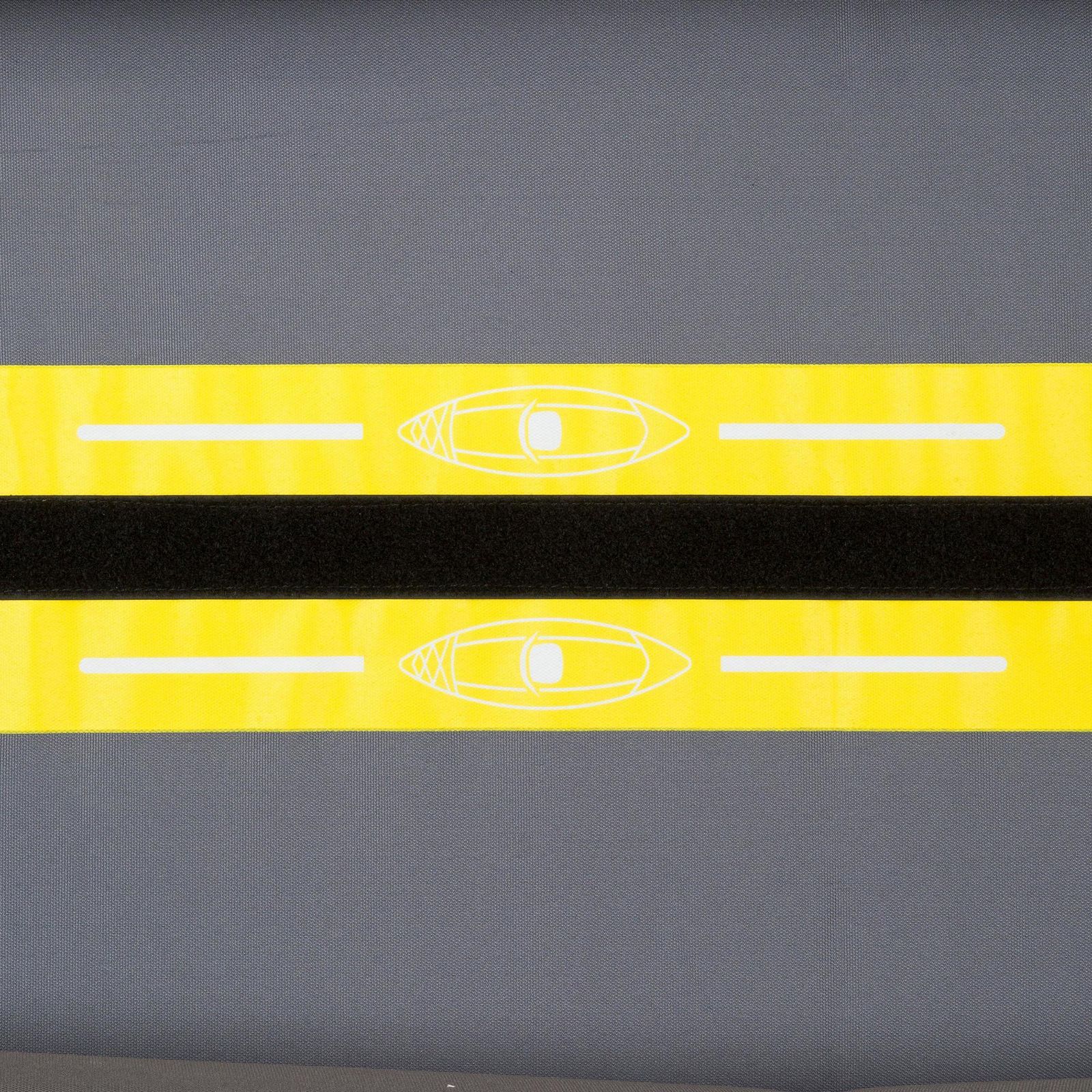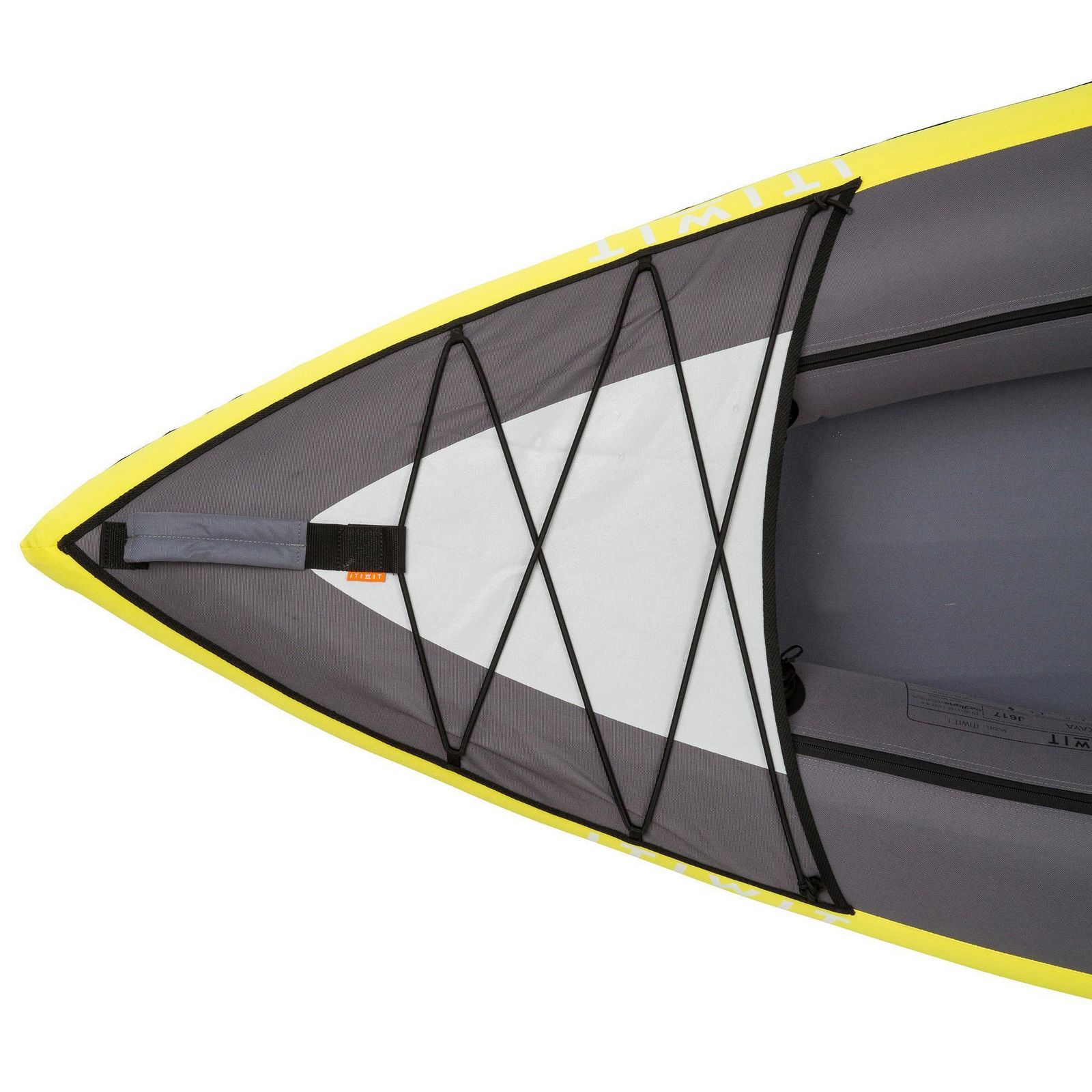 Каяк выполнен из армированной ПВХ ткани, его конструкция представляет собой: ПВХ днище и прикрепленный к нему тканевый корпус из Полиэстера, данный корпус оснащен двумя боковыми карманами на молниях вдоль всего корпуса в каждом из которых находится съемный надувной баллон, съемное надувное дно также расположено в своем отдельном тканевом чехле и вкладыввается внутрь каяка фиксируясь с помощью специального крепления.