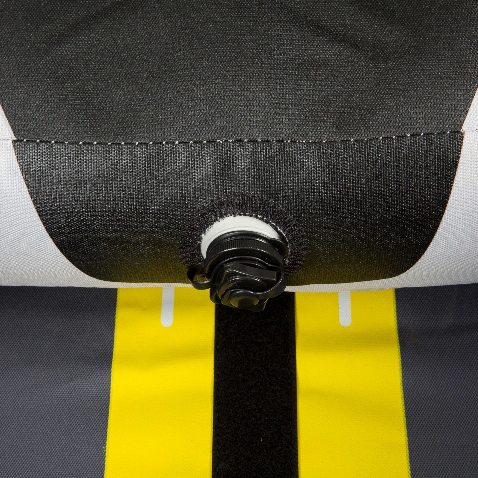 Сначала накачать дно, затем баллон, затем второй баллон на 50%. Проверить правильное расположение камер. Затем накачать каяк на 100%, не превышая отметки 0,1 бар (1,5 PSI). Тщательно закрыть все клапаны. Установить 3 плавника (кроме случаев плавания по маловодным рекам). В СИЛЬНУЮ ЖАРУ немного спустить каяк, находящийся на суше, чтобы избежать повреждения каяка из-за избытка внутреннего давления. Не сушить на солнце в надутом виде: риск превышения внутр. давления.