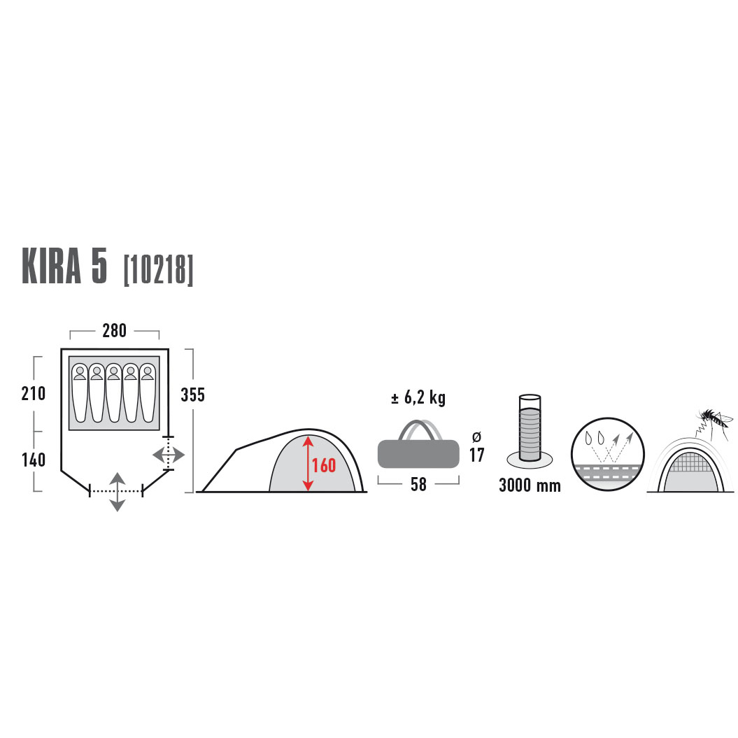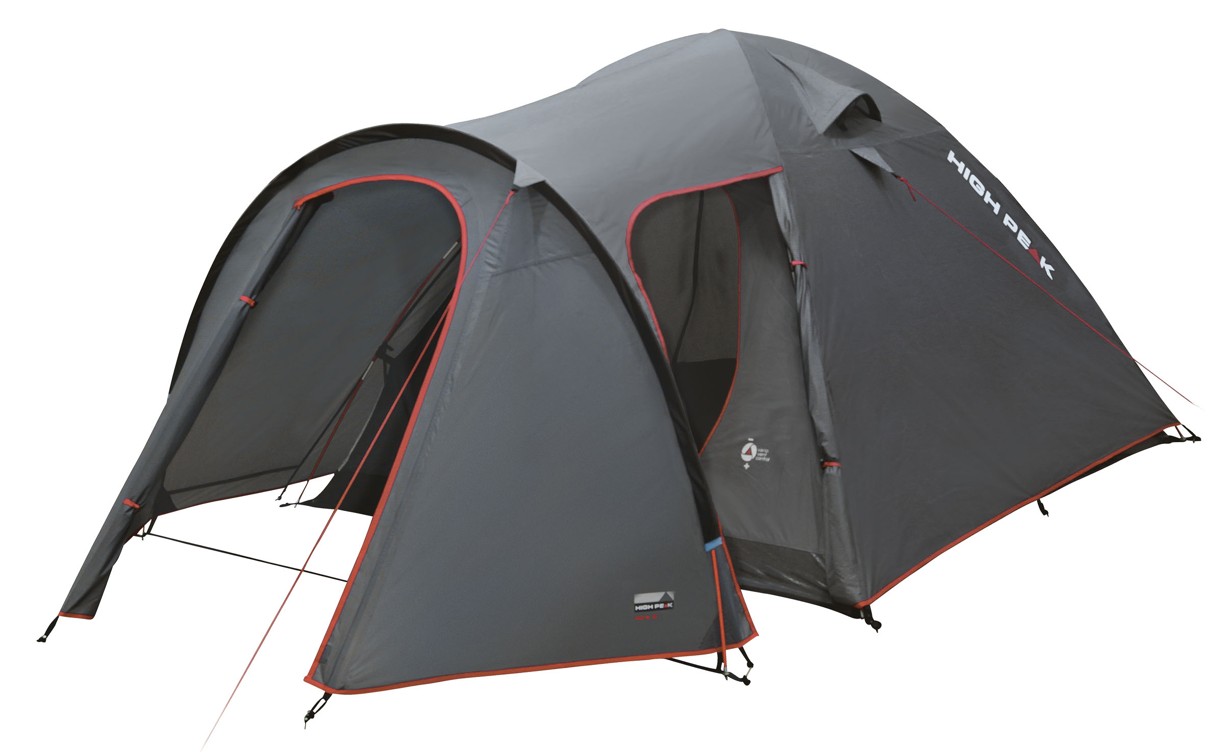 High Peak Kira 5 Dark Grey/Red (10218) - сучасний п'ятимісний кемпінговий намет для комфортного відпочинку на природі. Два роздільні входи, зручний просторий тамбур для речей та організації кухні, система вентиляції Vario Vent Control, проста установка.