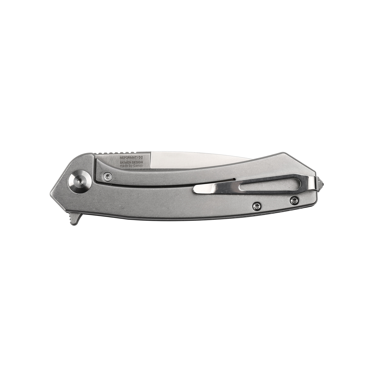 В составе ножа – сверхпрочная, стойкая к износу сталь марки D2. Защищённый от коррозии металлический сплав демонстрирует высокие показатели твёрдости. Значение твёрдости у ножа –порядка 60 единиц по шкале Роквелла, что достаточно хорошо для этого вида продукции. Тип заточки – прямой. Длина клинка составляет восемь с половиной сантиметров, толщина – три с половиной миллиметра. Нож складной, лезвие извлекается при помощи удобного замка Flipper. Skimen-CF надёжным образом защищён от случайного открытия либо закрытия. Он безопасен в эксплуатации, и имеет простую конструкцию. Общая длина ножа составляет 20,5 сантиметра. Такие незначительные габариты дают преимущество ножу для использования каждый день. Его можно запросто положить в сумку либо карман, и применять по необходимости, модель всегда под рукой.