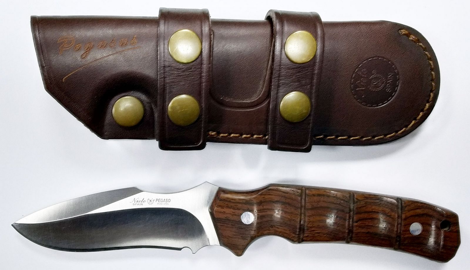 Нож Nieto Pegasus от испанской ножевой фирмы “Мигель Ньето” (Miguel Nieto, S.L.). Лезвие сделано из стали АН-58, длина лезвия 95 мм, толщина 4 мм, ручка из натурального дерева Cocobolo, включает ножны из натуральной кожи высшего качества с многопозиционным креплением на ремень.