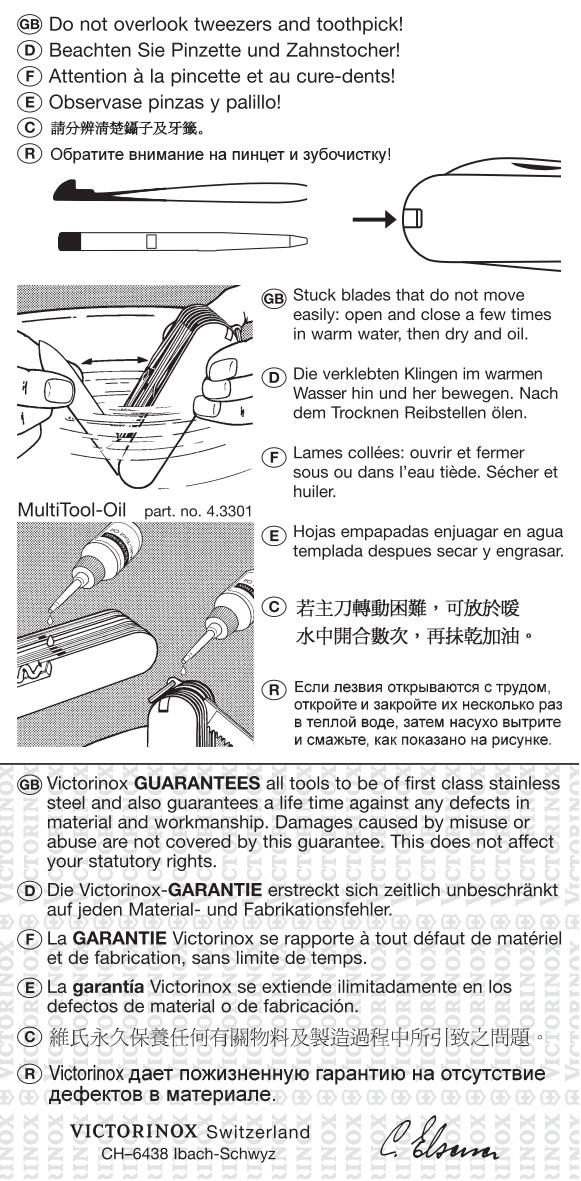 Материал, из которого выполнено лезвие и встроенные элементы - нержавеющая сталь высокого качества, рукоять - из пластика, верхний слой которого глянцевый нейлон. На данную модель производитель Victorinox дает пожизненную гарантию. Это является хорошим поводом остановить свой выбор на покупке ножа Victorinox 0.2303 Bantam.