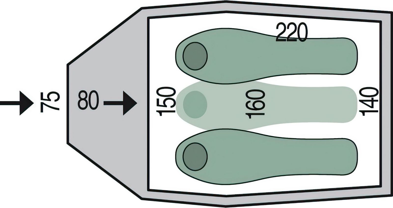 Высота внутренней палатки составляет 110 см. Она выполнена в форме прямоугольника. Вход располагается спереди. Пол выполнен из нейлона в сочетании с покрытием полиуретаном.