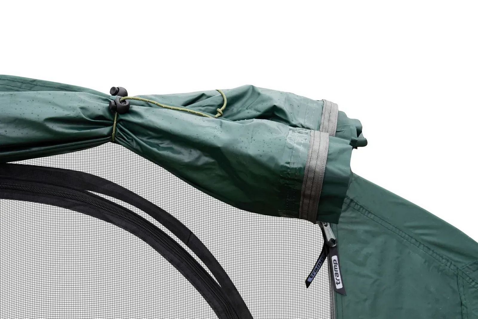 З 2018 року цей намет оновили і зараз в ньому вже 2 входи, а не один, як було раніше. Вентиляція реально не в 2 місцях, а по всій площині намету, бо зсередини він весь зроблен з антимоскітної сітки.