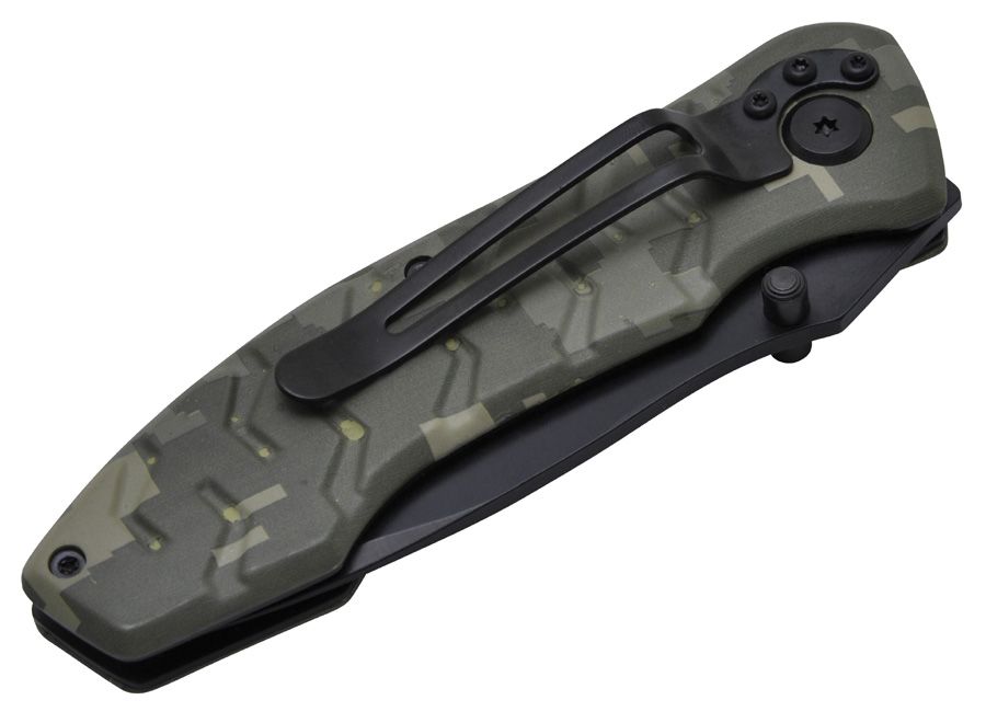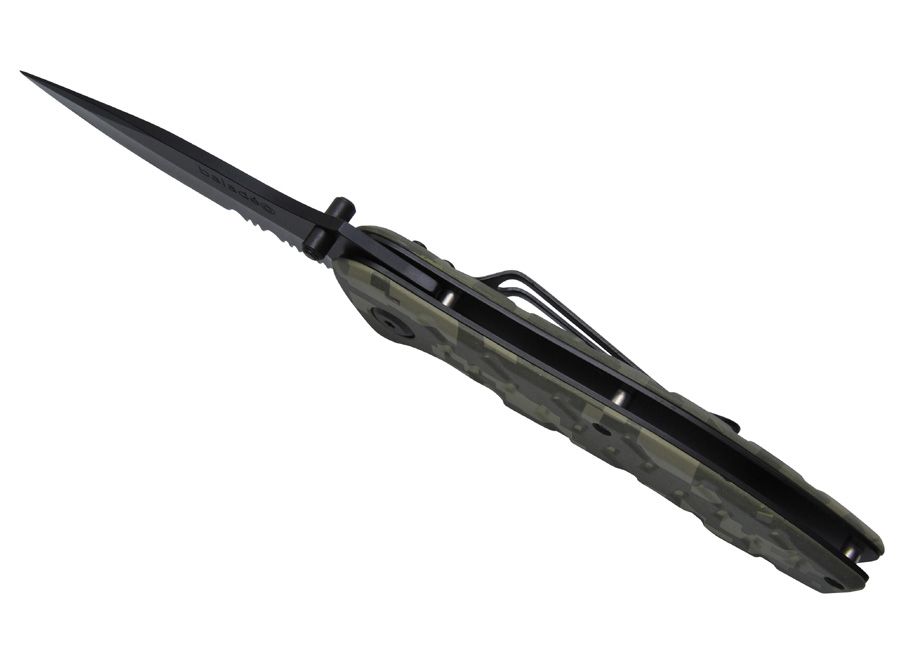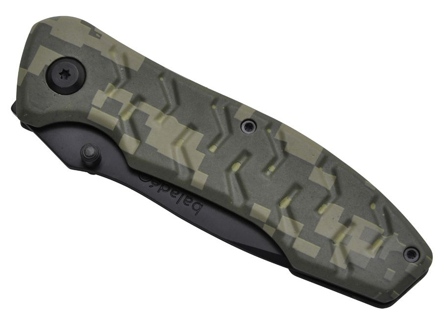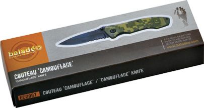 Карманный надежный тактический нож Baladeo Camouflage с черным матовым лезвием из нержавеющей стали с частичной серейторной заточкой. Рукоятка из нерж. стали и камуфлированного алюминия. Система блокировки, открывается и закрывается одной рукой, зажим для ремня.