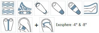 Специальная двухслойная конструкция препятствует образованию холодных воздушных карманов. Технология Dryzone предотвращает попадание влаги. На съёмном капюшоне анатомической формы есть специальные тесемки, которые регулируют размер. Имеется утепленный воротник, также предусмотрено отделение для подушки. Теплые флисовые вставки для ног, рук и поясницы надежно защищают от переохлаждения. Температура комфорта – 4 градуса ниже нуля.