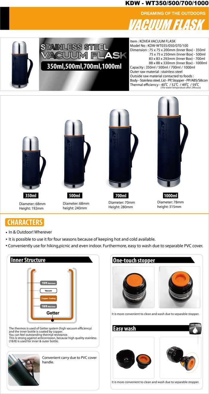 Термос Южной Корейской компании Kovea Carry Hot обьемом 0,5 литра с двойными вакуумными стенками из высококачественной нержавеющей пищевой стали 18/8 с внутренним покрытием медью. Корпус термоса покрыт пвх тканью из нее же сформована удобная ручка для переноски. Крышка термоса служит кружкой, а пробка с кнопкой позволяет легко наливать напитки. Вы сможете почувствовать отличное тепловое сопротивление термоса.