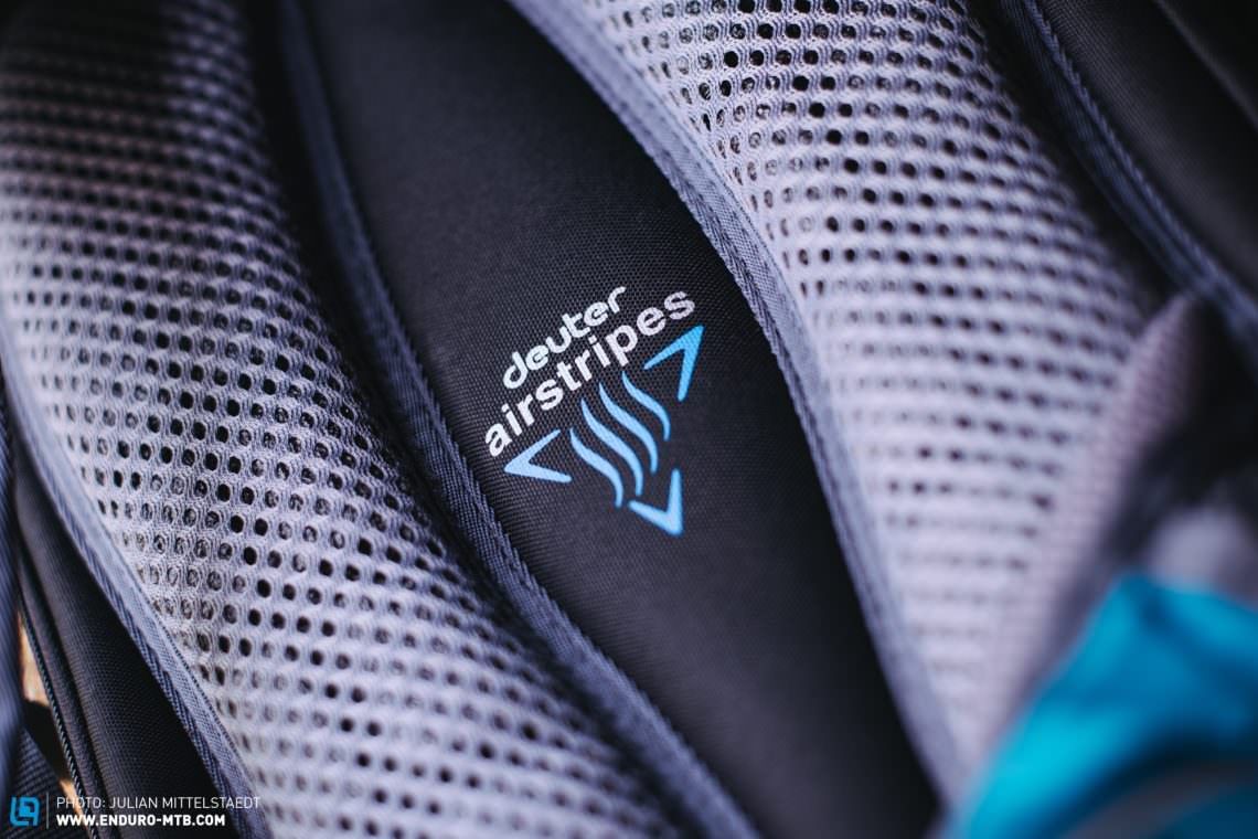 Для просто идеальной вентиляции этот рюкзак поставляется с сквозными сетчатыми плечевыми лямками и поясным ремнем сделанными из прочного полимера, которые в свою очередь полностью регулируются. Грудная стяжка с регулировкой и фиксацией на фастекс, широкий мега удобный пояс из сетки нивелирует любые раскачивания и прыжки, обеспечив идеальную фиксацию на вашем теле. Спинка Deuter Airstripes за счет своей продуманной конструкции делает так, что вашей спины будет касаться не более 10 процентов поверхности рюкзака, что естественно очень положительно скажется на вашем потоотделении. В общем, если вы ищете рюкзак для ежедневных катаний на велосипеде, куда можно было бы уместить буквально все самое необходимое, то все, ваш поиск закончен.