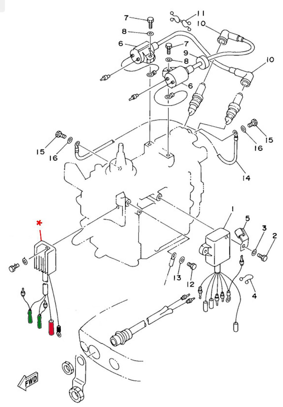 Выпрямитель напряжения без регулирования в сборе для моторов Yamaha мощностью от 4 до 70 л.с. и их китайских аналогов. Два зеленых провода к катушке под маховиком, красный + к аккумулятору, черный провод на корпус.