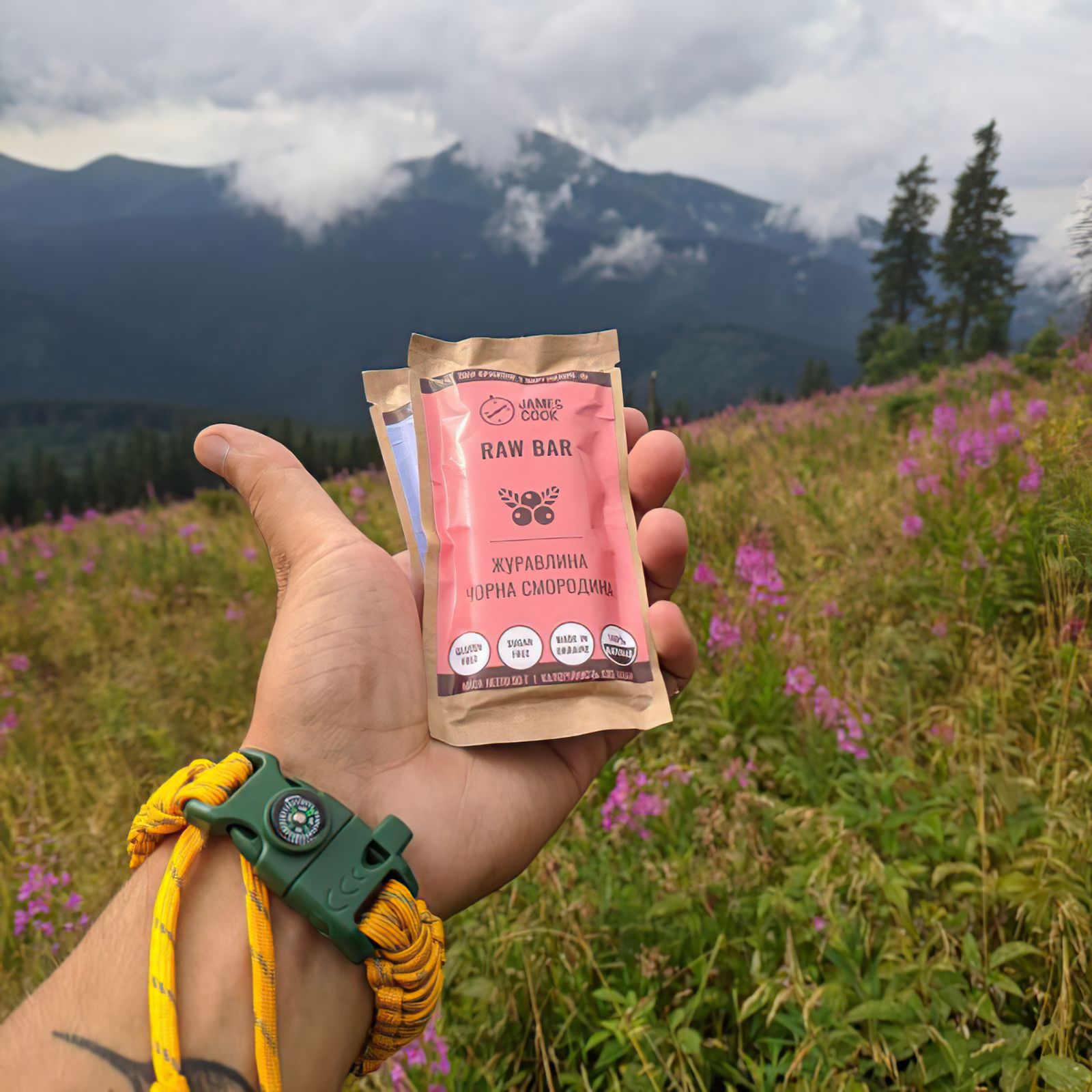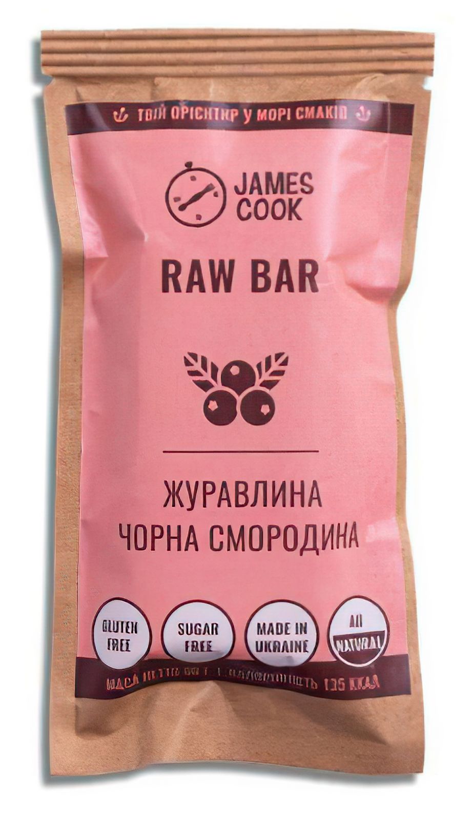 Батончик Raw Bar James Cook Журавлина-Чорна Смородина - яскравий мікс ягідних смаків в одній, зручній упаковці - то що потрібно для активного відпочинку. Склад батончика: журавлина, чорна смородина, фініки, родзинки, курага. Натуральні RAW-батончики James Cook виготовлені без термообробки, додавання цукру, консервантів, без глютену, барвників або ГМО. У них збережені всі вітаміни і корисні речовини горіхів, сухофруктів, ягід, насіння і прянощів, що входять до їх складу.