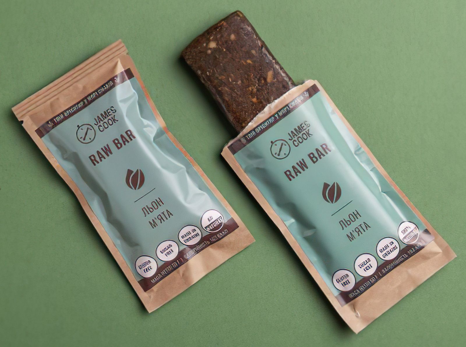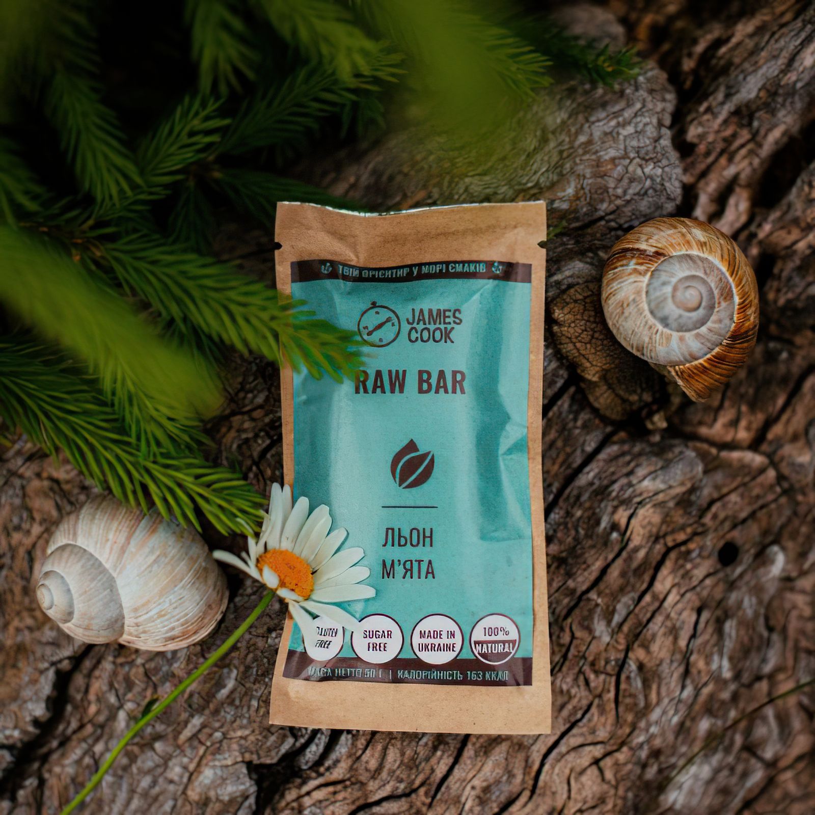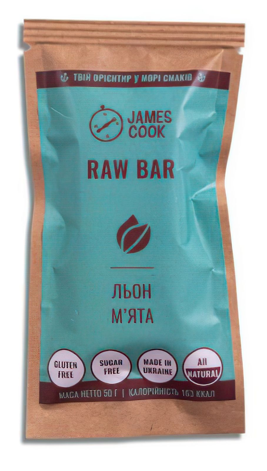 Батончик Raw Bar James Cook Льон-М'ята - смачний і енергоємний перекус, сублімована туристична їжа для походів і не тільки. У міру солодкий, добре відчувається свіжий смак м'яти. Склад батончика: м'ята, насіння льону, фініки, насіння соняшнику. Натуральні RAW-батончики James Cook виготовлені без термообробки, додавання цукру, консервантів,
