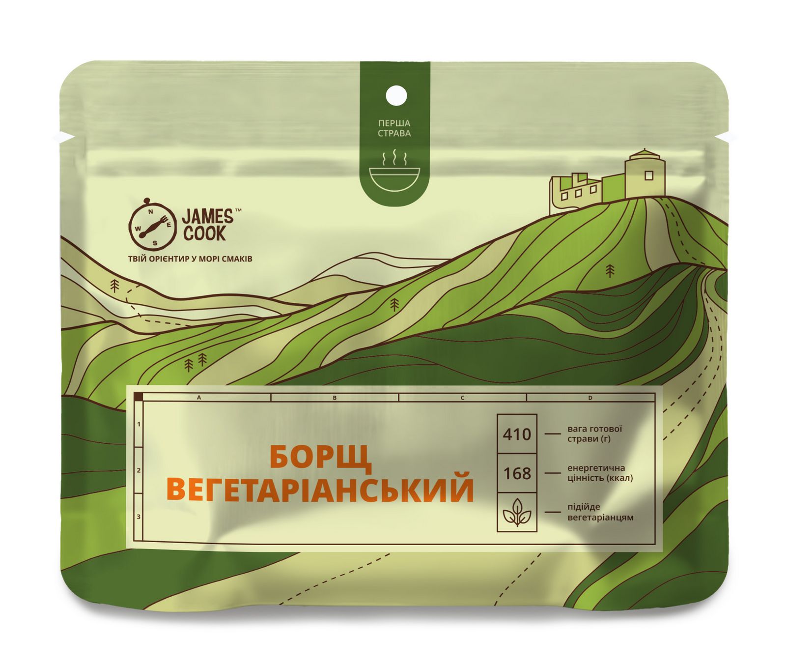 Борщ вегетаріанський James Cook - сублімована туристична їжа для походів. Складається з пропарених і сушених: квасоля, картопляні пластівці пропарені, капуста, буряк, морква, цибуля, кріп, часник, томатна паста, чорний перець, сіль. Страву виготовлено методом сушіння натуральних продуктів без використання консервантів та ГМО.