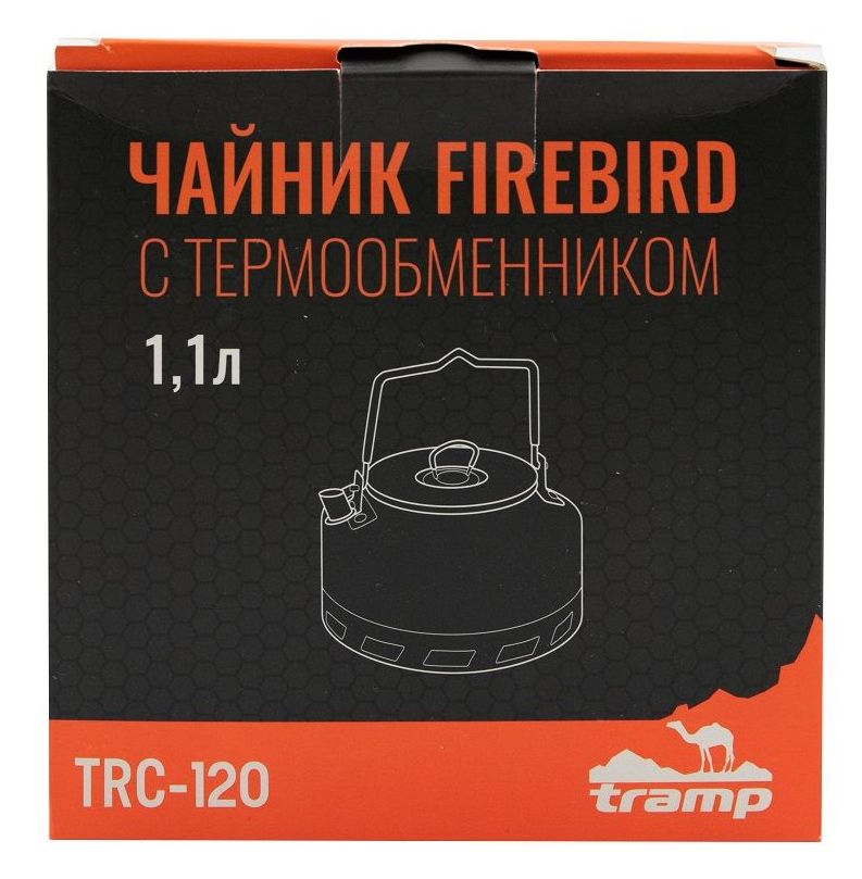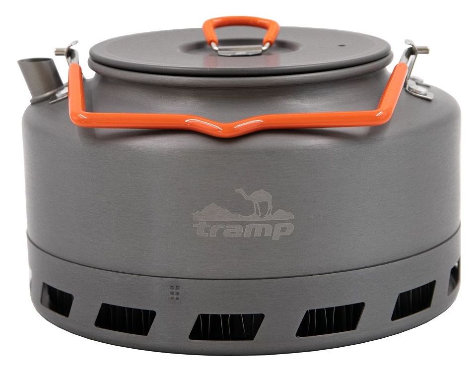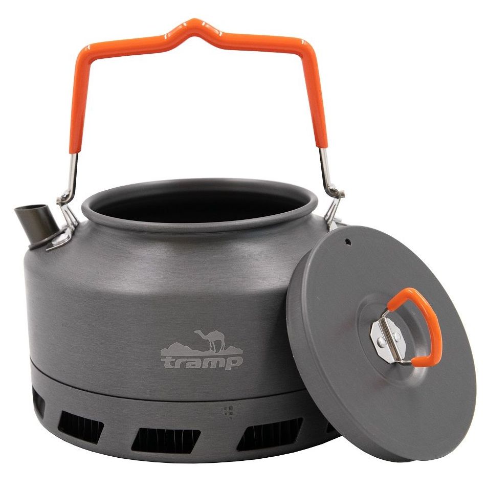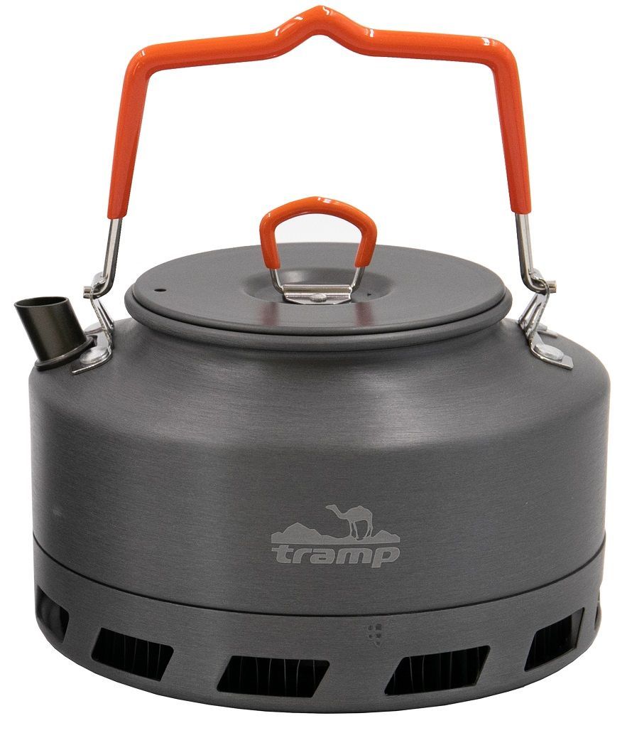 Похідний чайник Tramp TRC-120 об'ємом 1,1 літр з анодованого алюмінію з теплообмінним елементом, радіатором привареним точковим зварюванням в області дна, який збільшує ККД від використання теплової енергії на 30%, що в свою чергу економить паливо і час приготування. Чайник має знімну кришку з отворами для стравлювання пару і ручкою з термопластика. Складна ручка з покриттям з термопластика дозволяють зручно утримувати чайник.