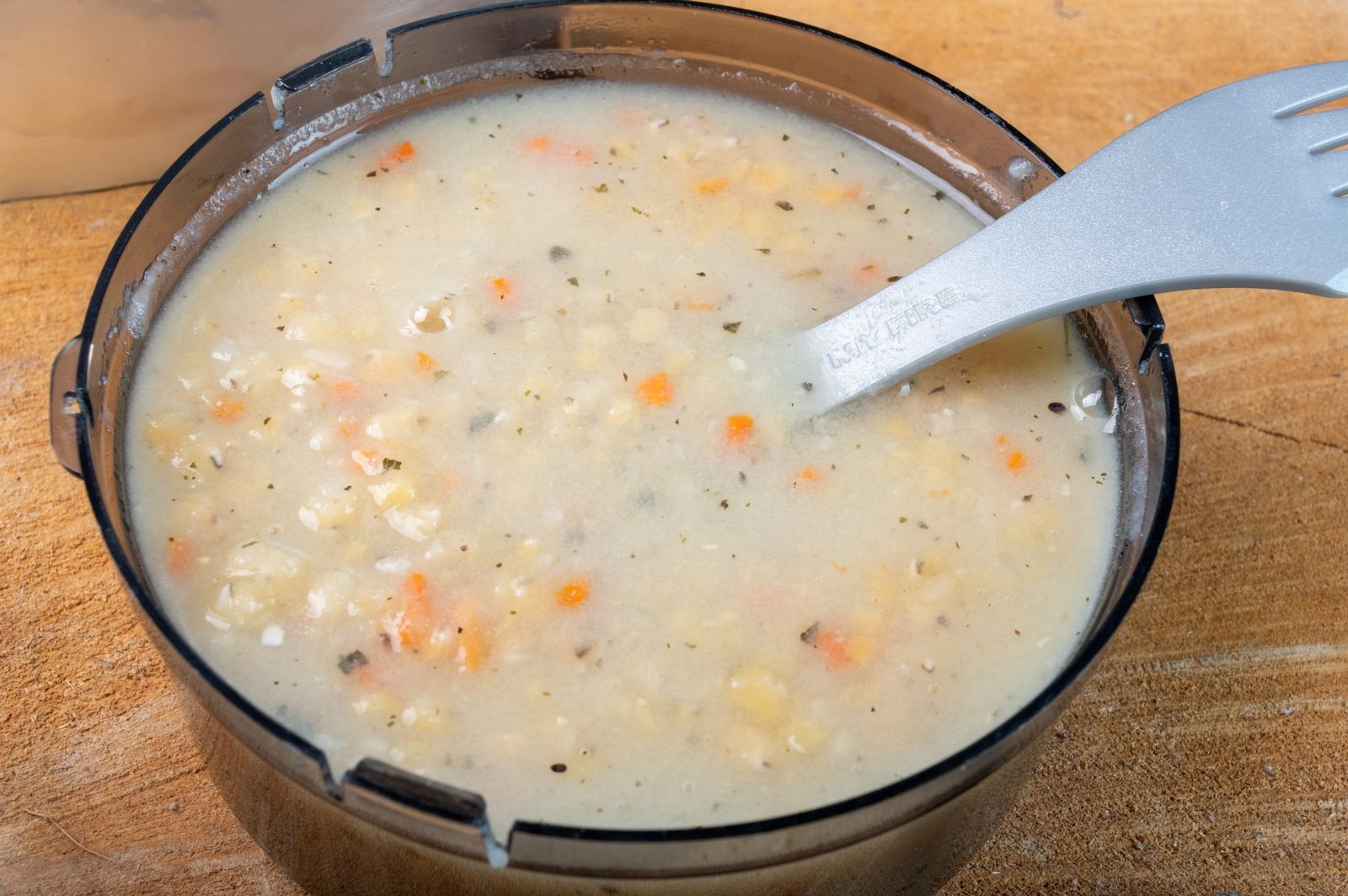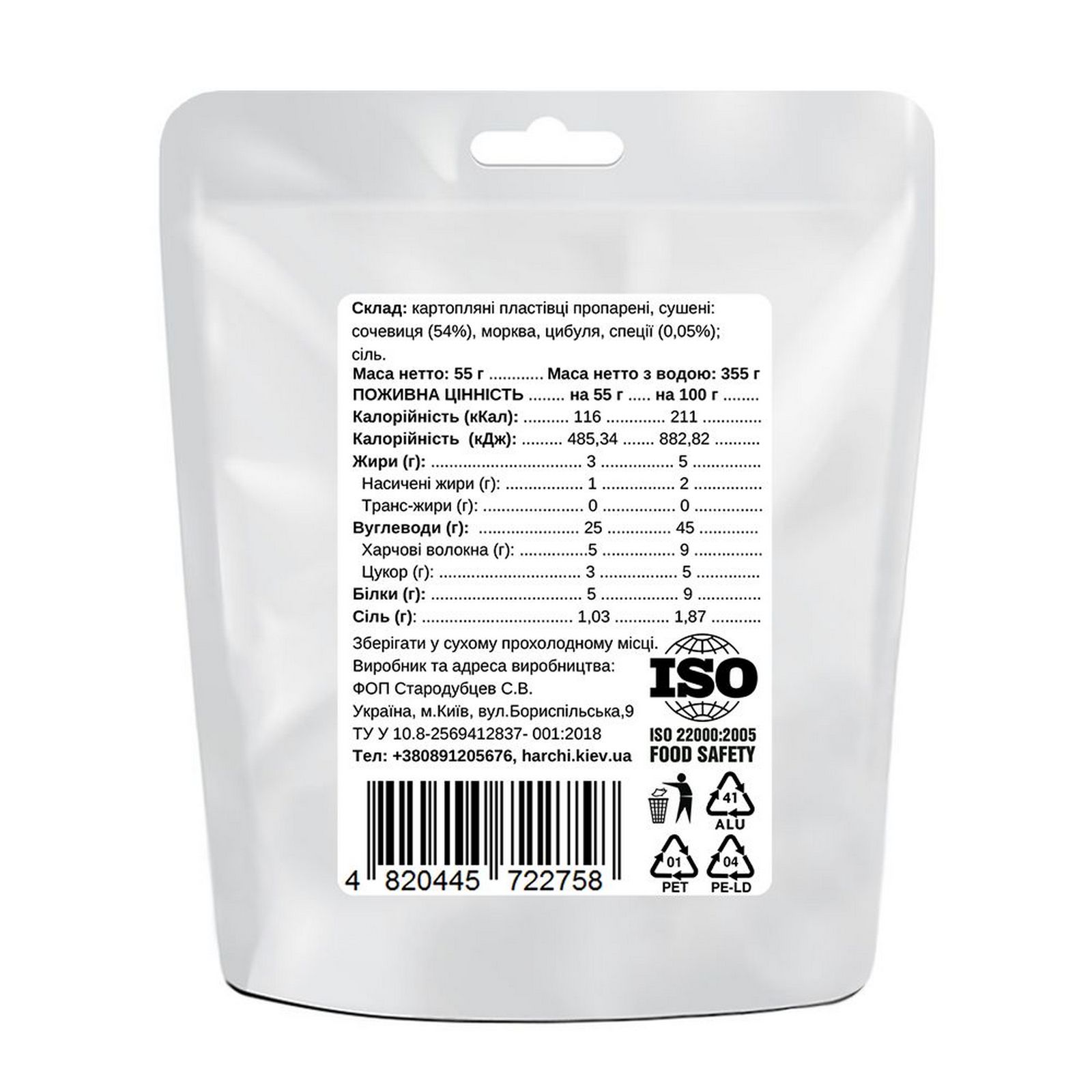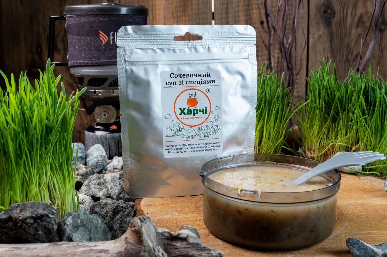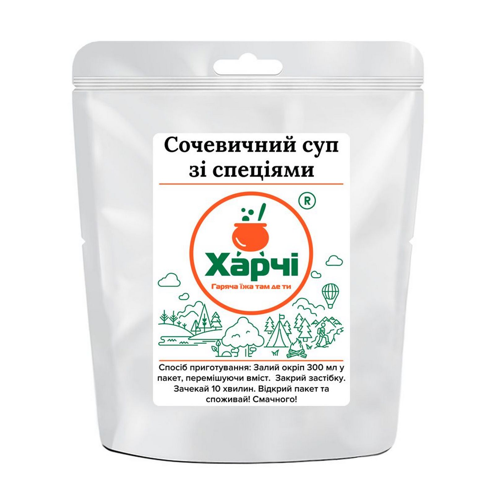 Сочевичний суп зі спеціями Харчі - сублімована туристична їжа для походів. Складається з пропарених і сушених: сочевиця, картопляні пластівці, моркву, цибулю, спеції, сіль. Страву виготовлено методом сушіння натуральних продуктів без використання консервантів та ГМО.