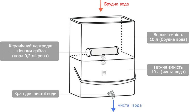 - Автономний гравітаційний фільтр з робочим об'ємом для брудної та чистої води по 10 літрів