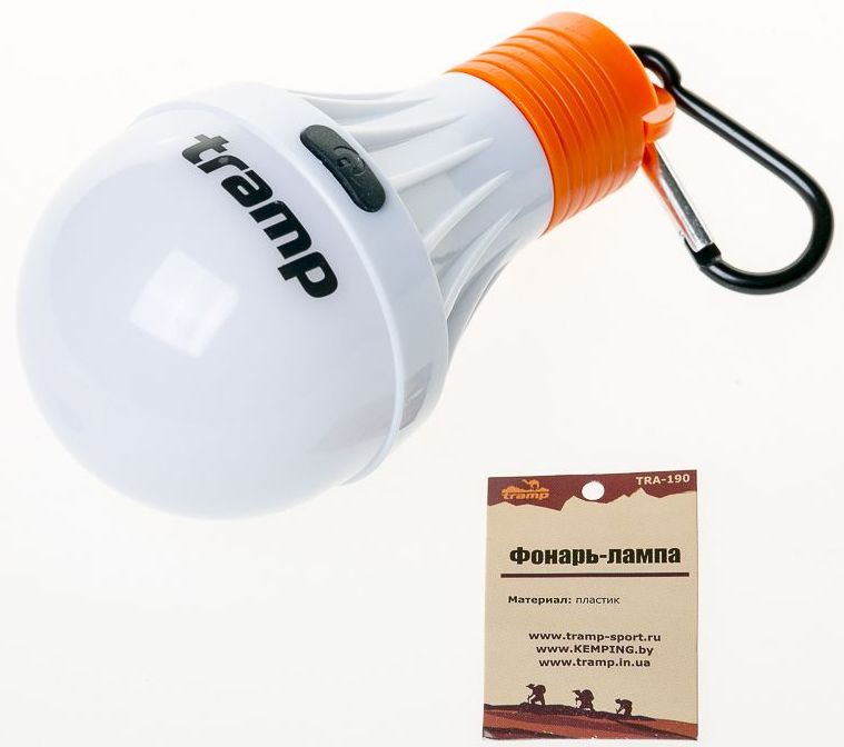 Туристична світлодіодна лампа - ліхтар Tramp TRA-190 для кемпінгу, дачі і будинки, яку можна легко підвісити в наметі, на гілці або іншому зручному місці за допомогою металевого карабіна. Лампа зроблена у вигляді звичайної лампочки розжарювання, видає 30 люмен яскравості м'якого не сліпучого світла за рахунок кришки розсіює світловий потік.