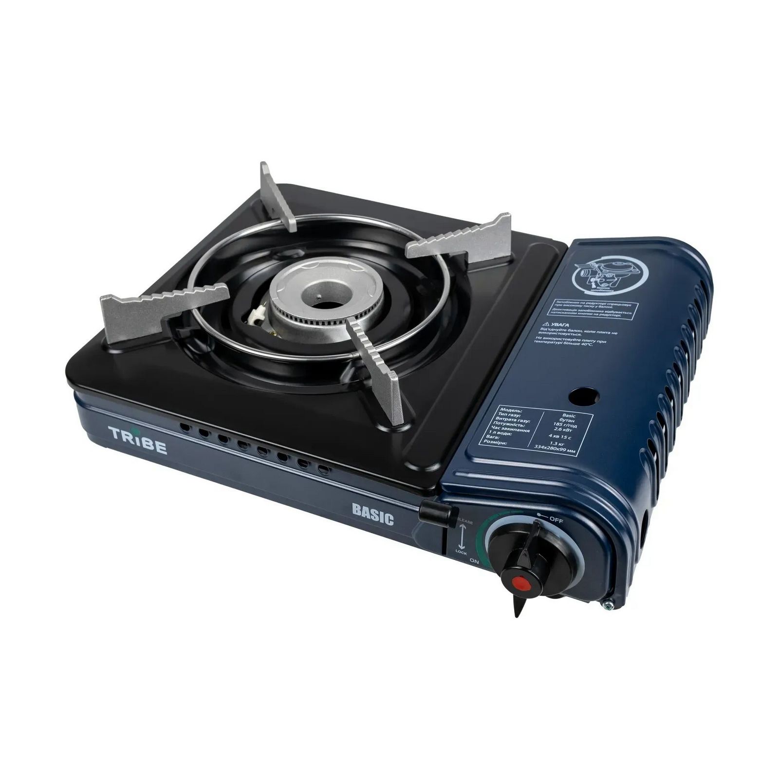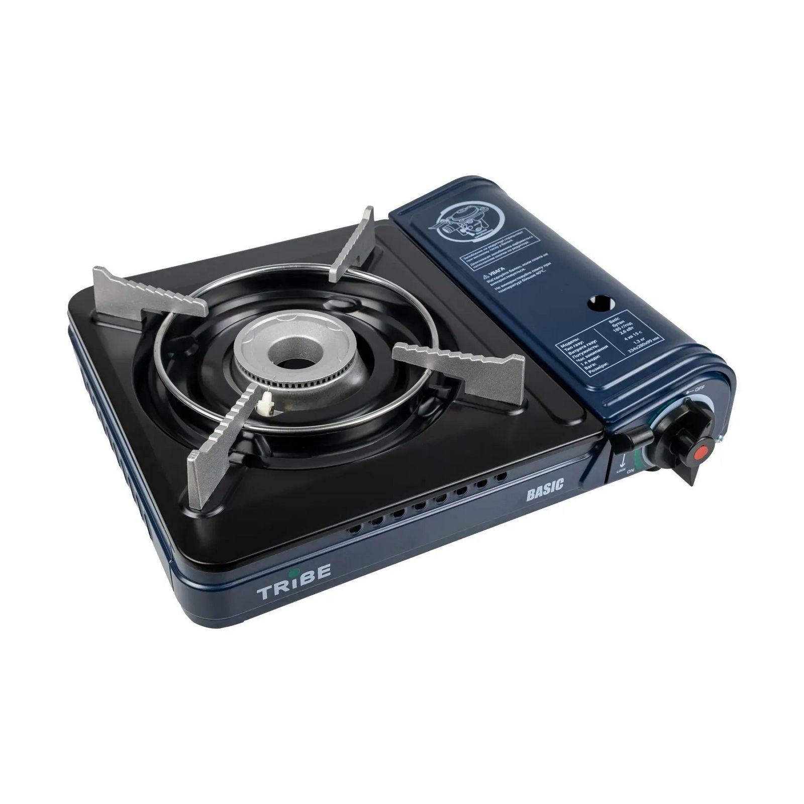 Туристична газова плита Tribe Basic — базова в лінійці портативних плит Tribe, працює від стандартного цангового (штокового) газового картриджа (балона).