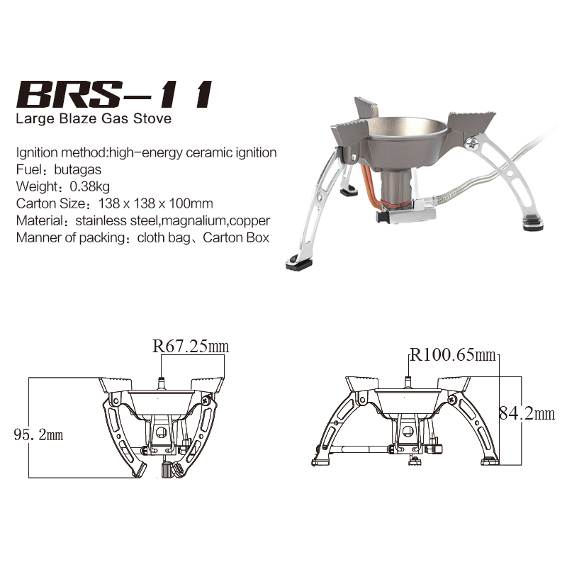 Модель BRS-11 являє собою газовий пальник з мідного сплаву високої міцності і нержавіючої сталі, стійкої до високих температур. Особливість пальника - полум'я, що обертається і надає пальнику великої ефективністі. Важливо і те, що тут є функція вітрозахисту, а також постійний підігрів газу. Це має значення для експлуатації в зимовий час, в період холодів.