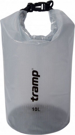 Гермомішок Tramp об'ємом 10 літрів з міцної 100% водонепроникної прозорої ПВХ тканини з брезентовим "терпаулин" армуванням. Додатково посилене дно, система закривання RollProff. Дуже зручний у використанні, так як видно, що і де знаходиться в мішку.