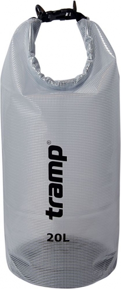 Гермомішок Tramp об'ємом 20 літрів з міцної 100% водонепроникної прозорої ПВХ тканини з брезентовим "терпаулин" армуванням. Додатково посилене дно, система закривання RollProff. Дуже зручний у використанні, так як видно, що і де знаходиться в мішку.