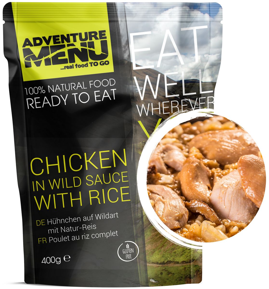 Готова страва Курка в гострому соусі з рисом Adventure Menu Chicken in wild sauce with rice. Через ідеально збалансований смак та її поживні цінності це, мабуть, наша найулюбленіша страва! Курячі шматочки приготовані на пару у вершковому соусі з цибулею, беконом і томатним пюре. Разом з цільнозерновим рисом, ця страва надзвичайно багата вітамінами і клітковиною. Це легка страва, яка повністю наситить ваш шлунок, чи є ви крутим спортсменом або звичайним туристом.