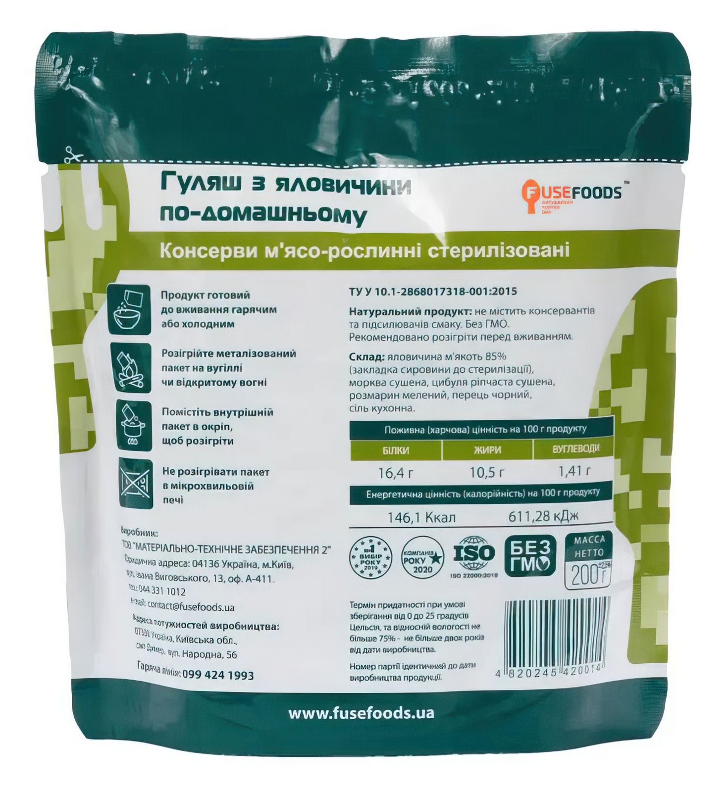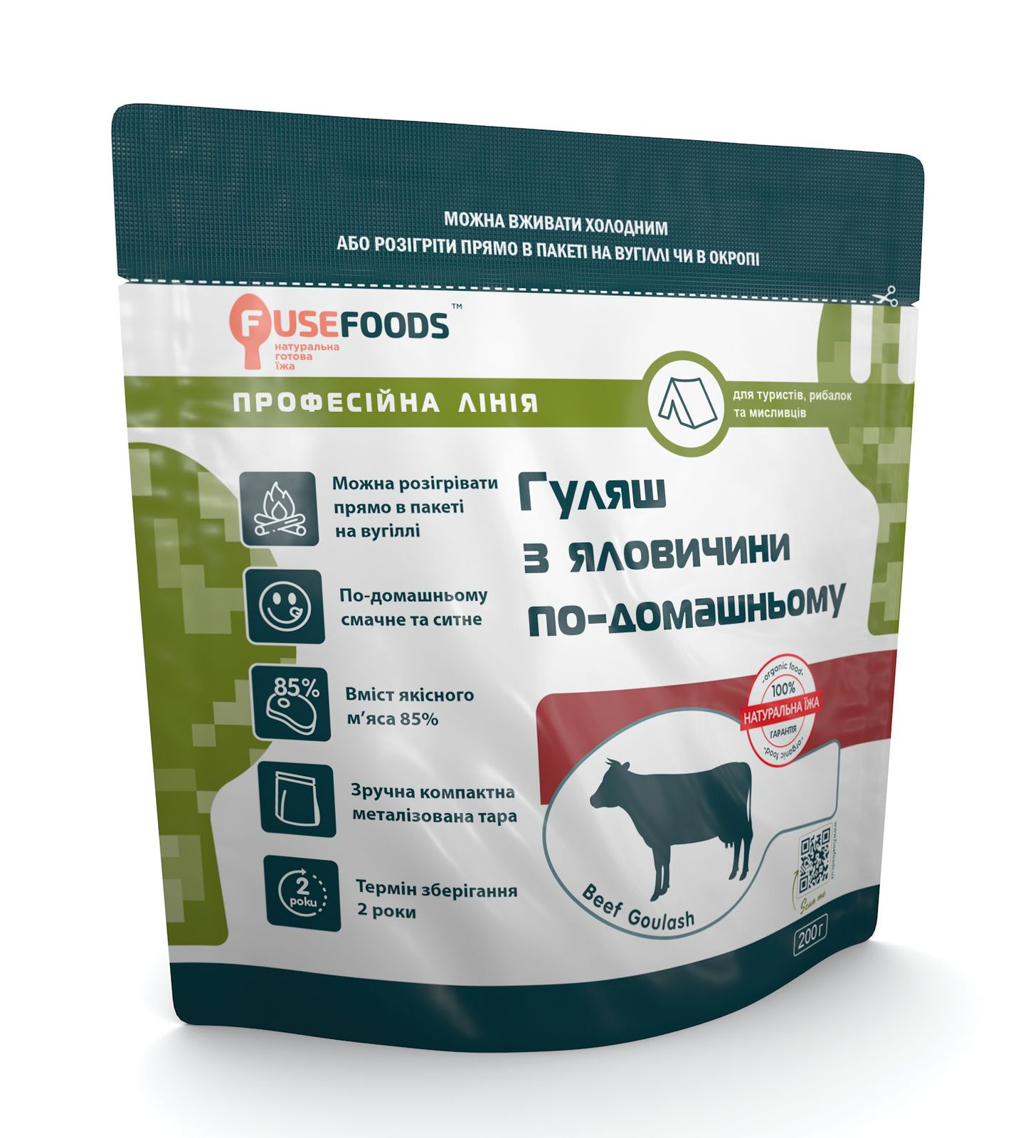 Гуляш з яловичини по-домашньому Fuse Foods є повністю натуральною і готовою стравою тривалого зберігання. Також подібні страви називають - Meal, Ready-to-Eat або MRE «МРЕ» - «Їжа, готова до вживання», а також ІРП - індивідуальний раціон харчування. Високоенергетичні поживні екологічно чисті продукти - не містить консервантів, підсилювачів смаку, загусників, стабілізаторів, регуляторів кислотності. Склад: Яловичина м'якоть 85%, морква сушена, цибуля ріпчаста сушений, розмарин мелений, перець чорний, сіль.