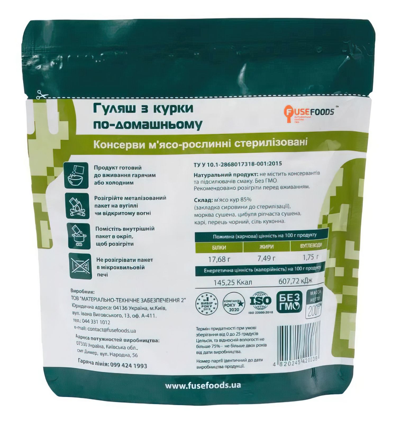 Гуляш з курки по-домашньому Fuse Foods є повністю натуральною і готовою стравою тривалого зберігання. Також подібні страви називають - Meal, Ready-to-Eat або MRE «МРЕ» - «Їжа, готова до вживання», а також ІРП - індивідуальний раціон харчування. Високоенергетичні поживні екологічно чисті продукти - не містить консервантів, підсилювачів смаку, загусників, стабілізаторів, регуляторів кислотності. Склад: М'ясо куряче 85%, морква сушена, цибуля ріпчаста, карі, перець чорний, сіль.