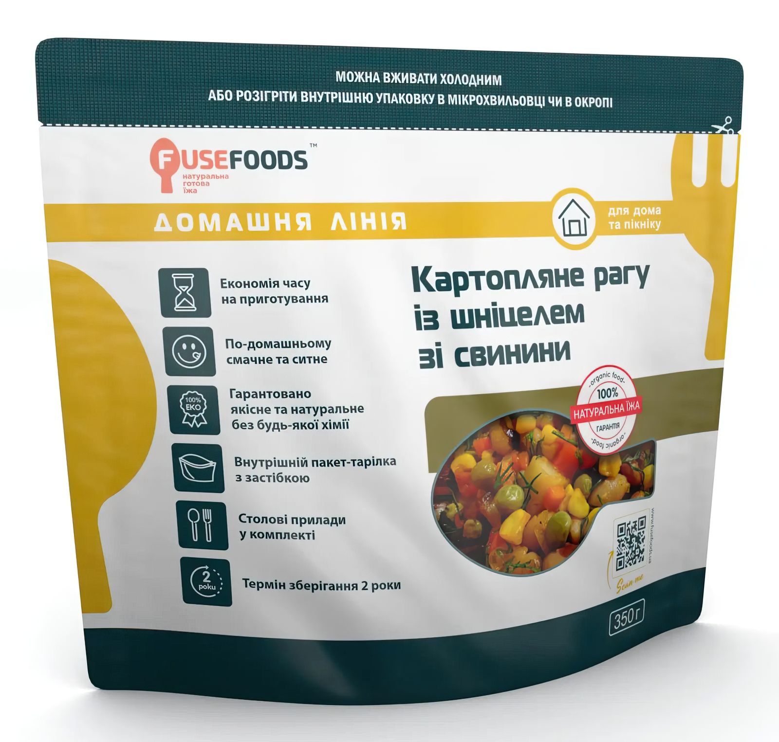 Картопляне рагу з шніцелем зі свинини Fuse Foods є повністю натуральною і готовою стравою тривалого зберігання. Також подібні страви називають - Meal, Ready-to-Eat або MRE «МРЕ» - «Їжа, готова до вживання», а також ІРХ - індивідуальний раціон харчування. Високоенергетичні поживні екологічно чисті продукти - не містить консервантів, підсилювачів смаку, загусники, стабілізаторів, регуляторів кислотності. Склад:.