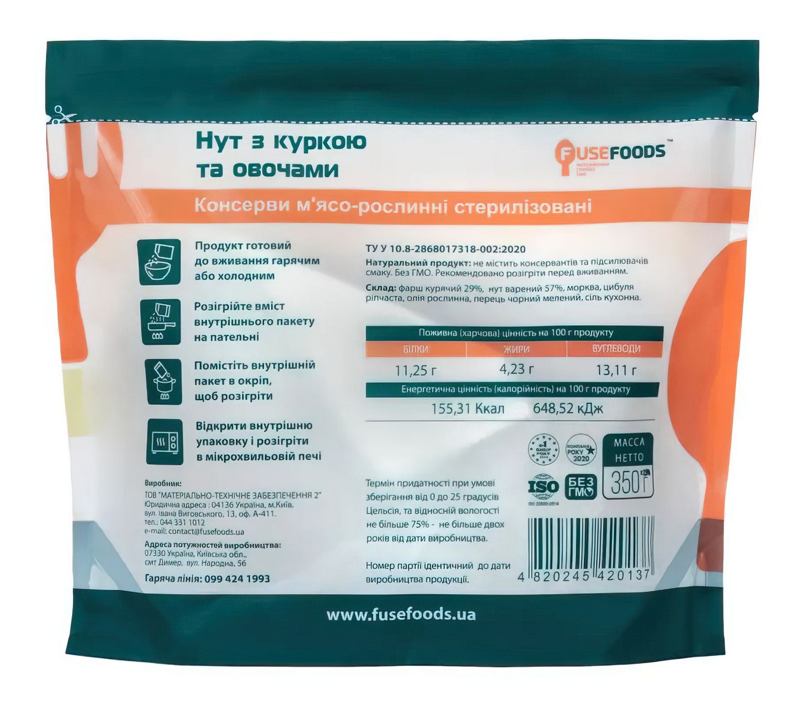 Нут з куркою і овочами Fuse Foods є повністю натуральною і готовою стравою тривалого зберігання. Також подібні страви називають - Meal, Ready-to-Eat або MRE «МРЕ» - «Їжа, готова до вживання», а також ІРП - індивідуальний раціон харчування. Високоенергетичні поживні екологічно чисті продукти - не містить консервантів, підсилювачів смаку, загусників, стабілізаторів, регуляторів кислотності. Склад: Фарш курячий 29%, нут варений 57%, морква, цибуля ріпчаста, олія рослинна, перець чорний мелений, сіль.