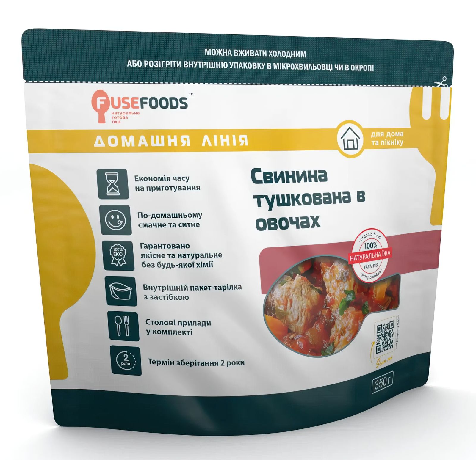 Свинина тушкована в овочах Fuse Foods є повністю натуральною і готовою стравою тривалого зберігання. Також подібні страви називають - Meal, Ready-to-Eat або MRE «МРЕ» - «Їжа, готова до вживання», а також ІРХ - індивідуальний раціон харчування. Високоенергетичні поживні екологічно чисті продукти - не містить консервантів, підсилювачів смаку, загусники, стабілізаторів, регуляторів кислотності. Склад:.