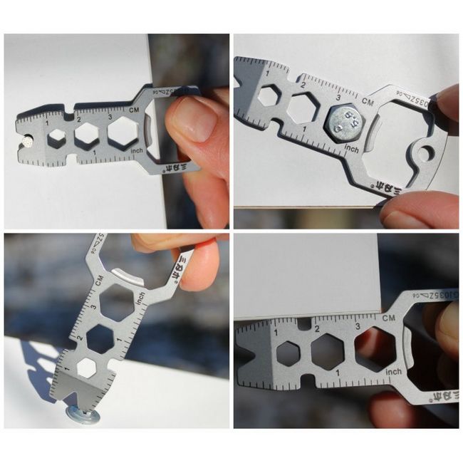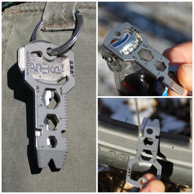 Компоненти: гайковий ключ (5 мм, 8 мм, 10 мм), плоска викрутка, обценьки, лінійка (3,5 см і 1,5 дюйма), отвір для згинання дроту, відкривачка для пляшок, ключ для спиць (3 мм і 3,5 мм).