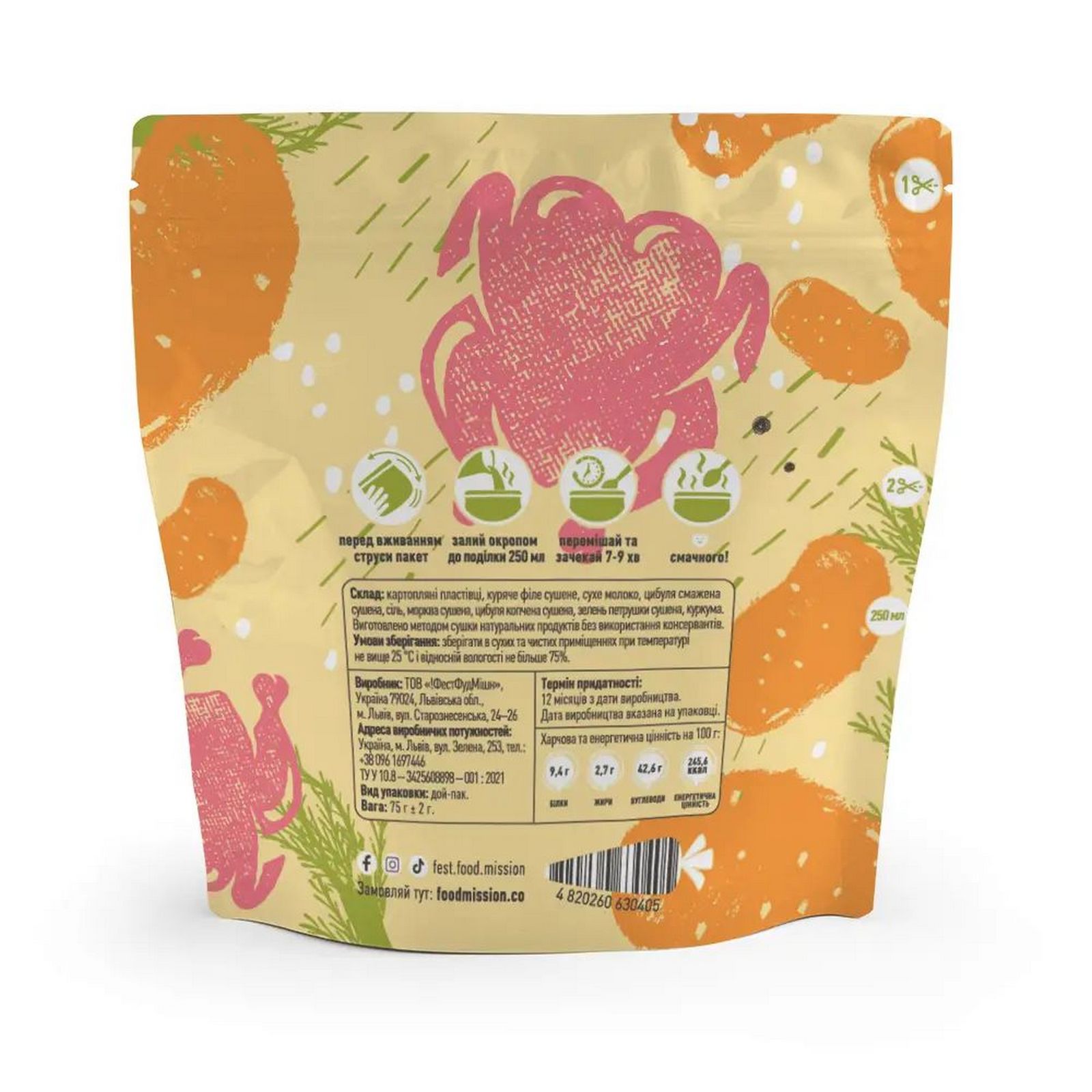 Картопляне пюре з курячим філе Fest Food Mission – сублімована туристична їжа для походів. Складається з пропарених і сушених: картопляні пластівці, куряче філе сушене, сухе молоко, цибуля смажена сушена, сіль, морква сушена, цибуля копчена сушена, зелень петрушки сушена, куркума. Страва виготовлена методом сушіння натуральних продуктів без використання консервантів та ГМО.