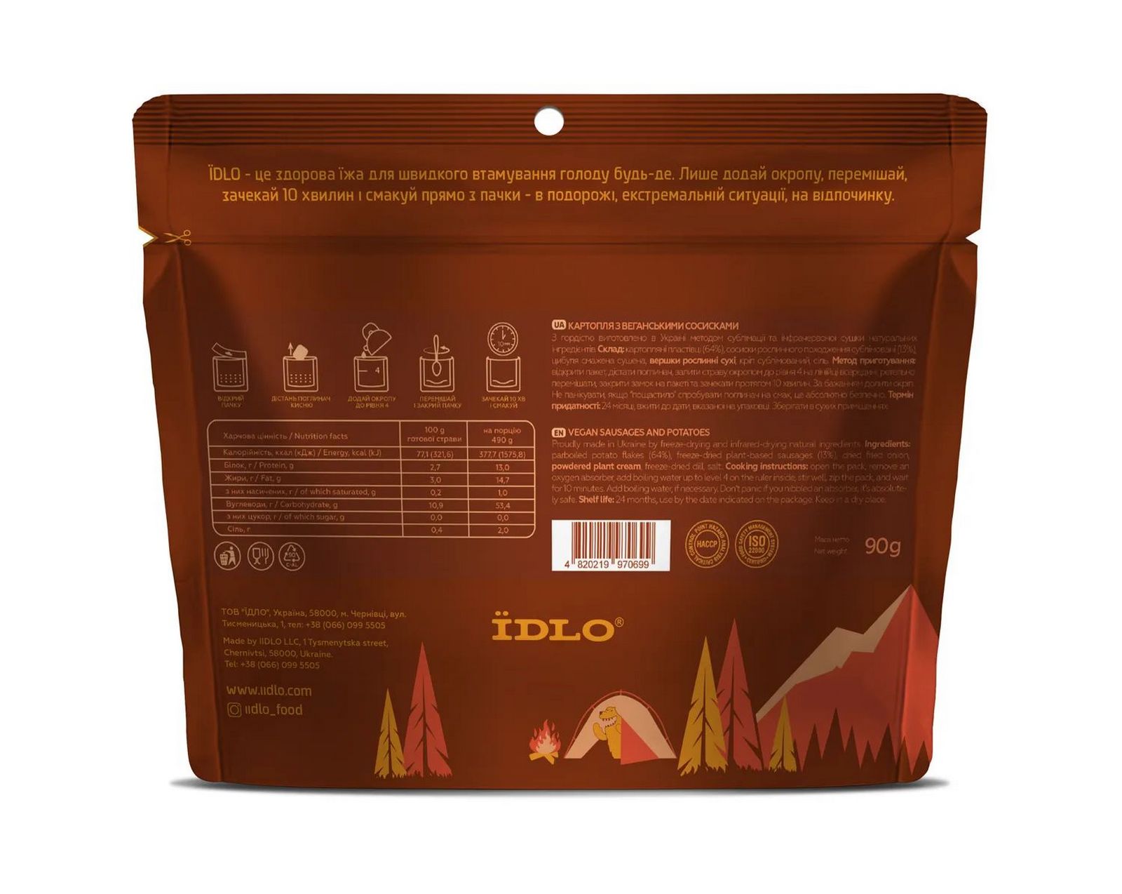 Метод приготування: відкрити пакет, дістати поглинач, залити страву окропом до рівня 4 на лінійці всередині, ретельно перемішати, закрити замок на пакеті та зачекати протягом 10 хвилин. За бажанням долити окріп. Не панікувати, якщо “пощастило” спробувати поглинач на смак, це абсолютно безпечн