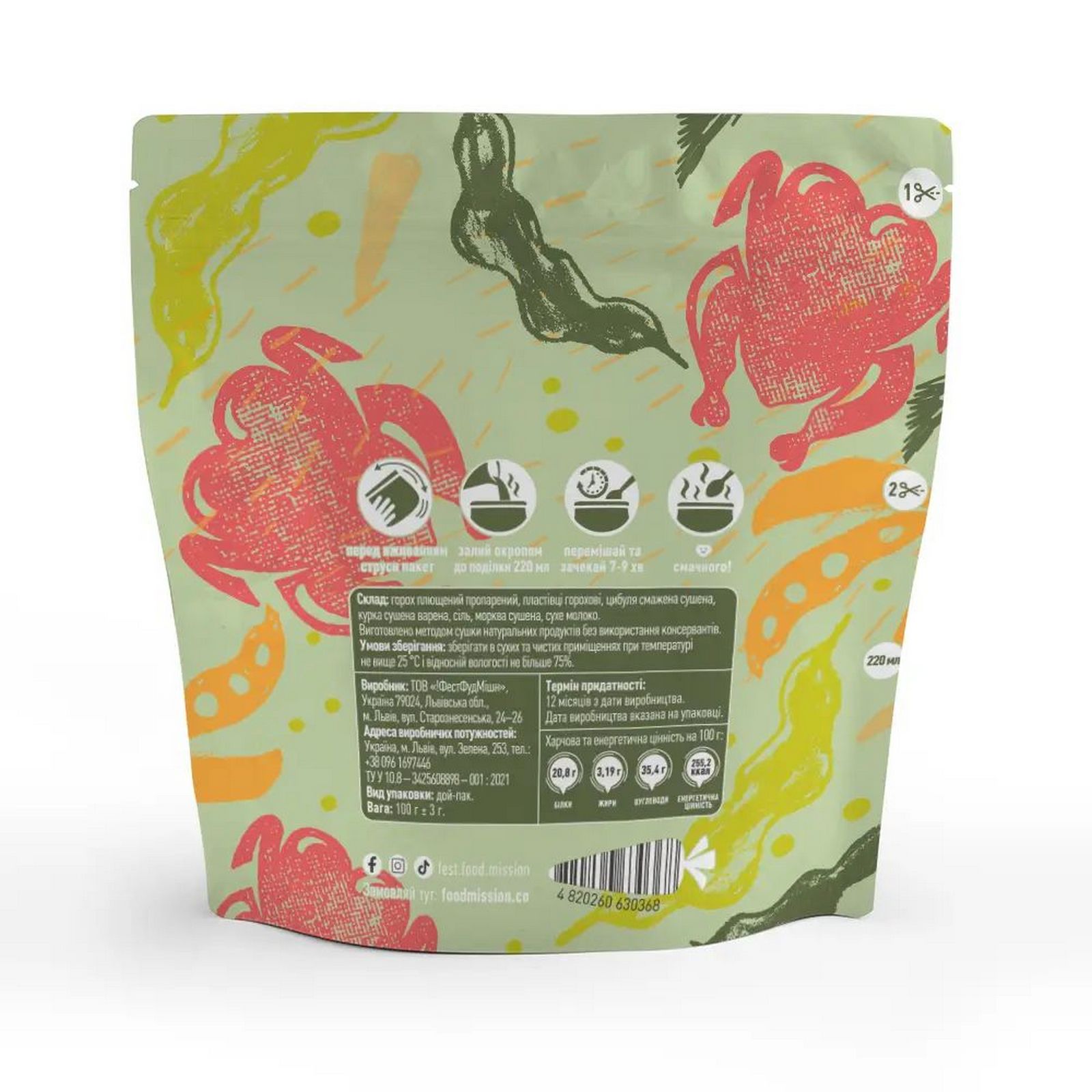 Каша горохова з курячим філе Fest Food Mission – сублімована туристична їжа для походів. Складається з пропарених і сушених: варена сушена яловичина, пластівці горохові пропарені, цибуля смажена сушена, морква сушена, корінь пастернаку сушений, їй молоко, сіль, перець. Страва виготовлена методом сушіння натуральних продуктів без використання консервантів та ГМО.