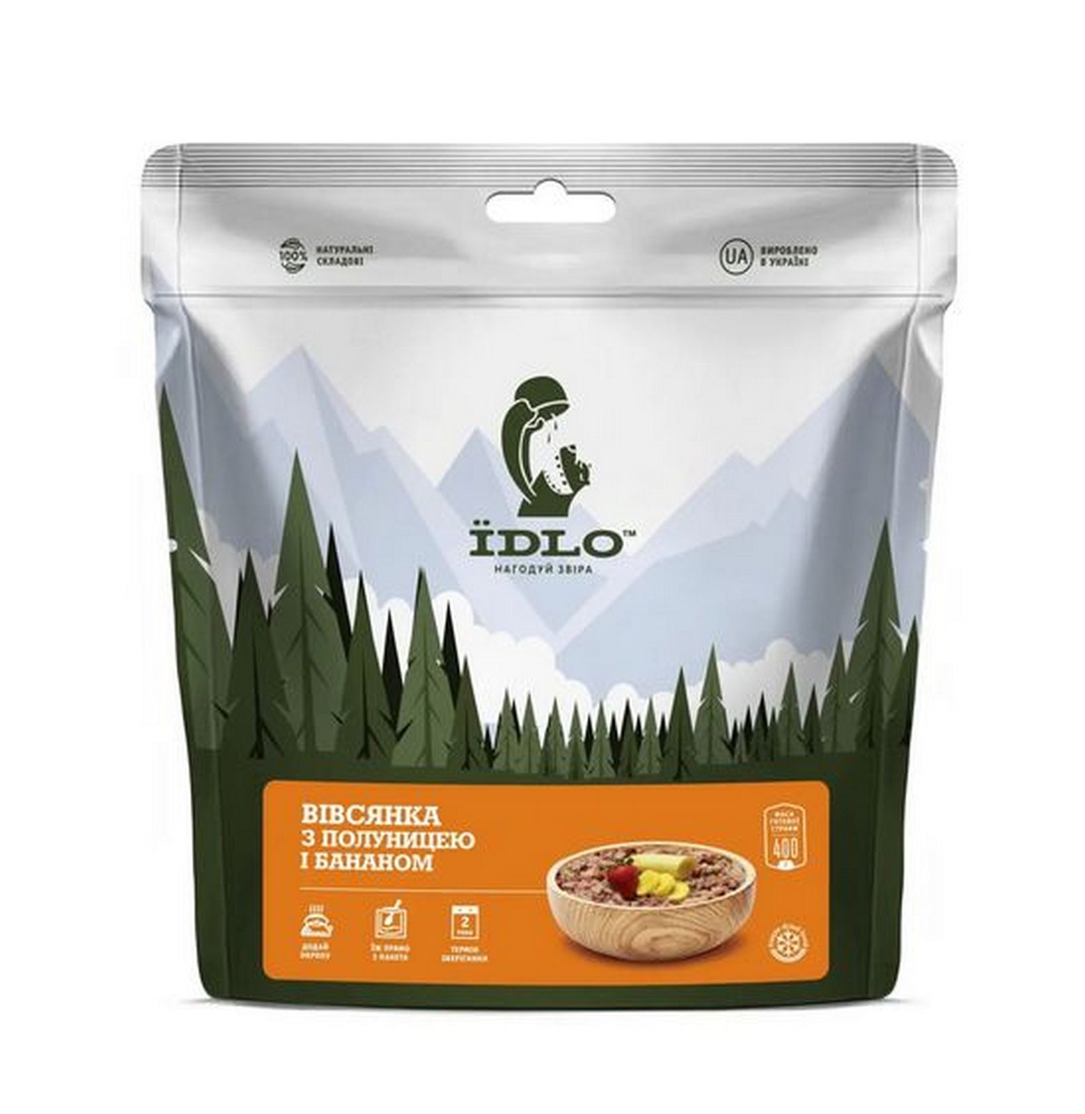 Склад: вівсяні пластівці, полуниця сублімована, банан сублімований, сухі вершки, цукор. Виготовлено методом сублімації та інфрачервоного сушіння натуральних інгредієнтів без використання консервантів та ГМО.