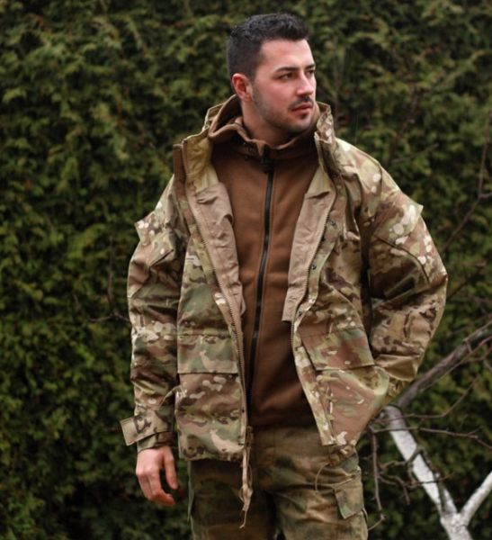 - Капюшон, сумісний з балістичними шоломами, регулюється шнуром з фіксаторами, ховається в комір