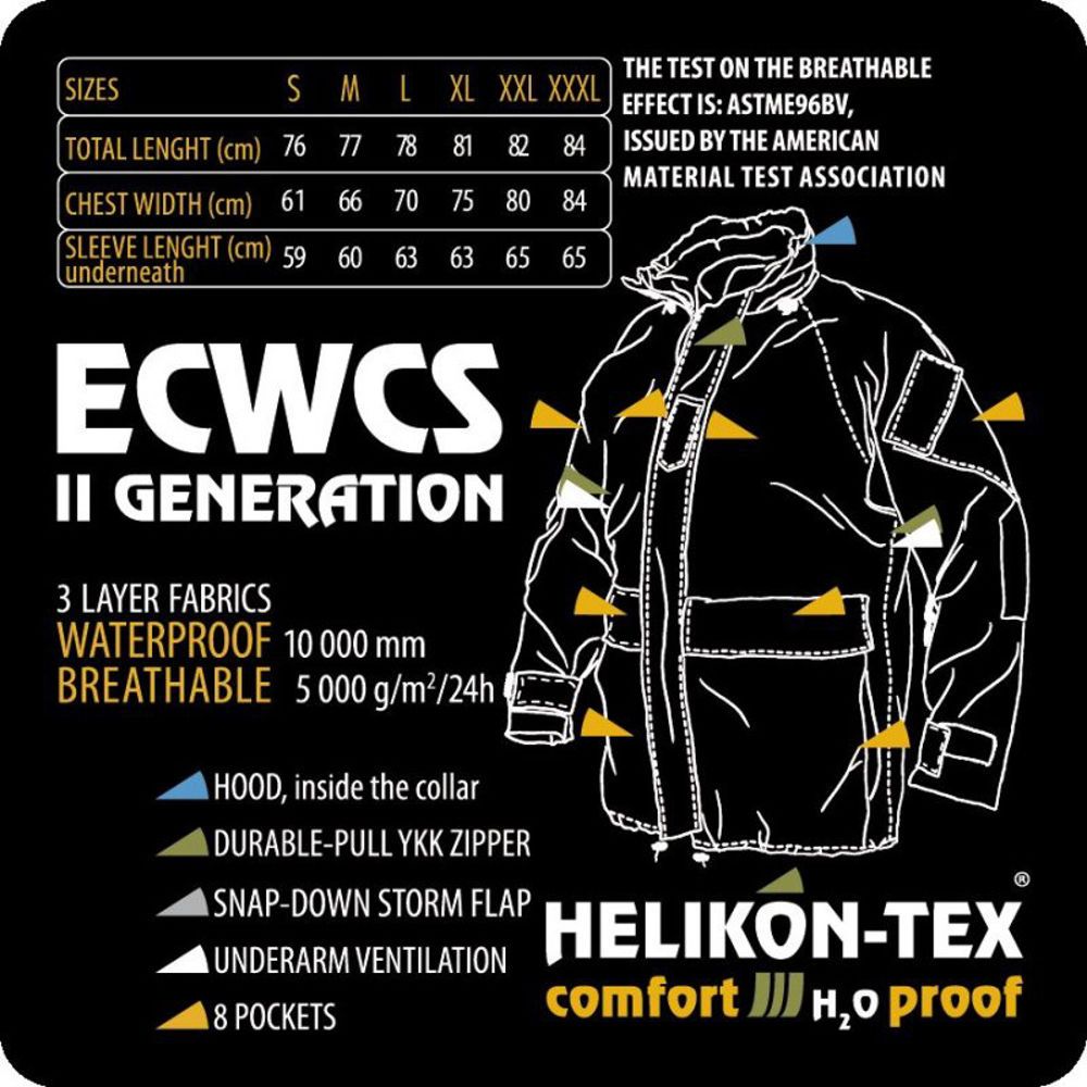 Куртка Helikon-Tex ECWCS II - була розроблена американською класифікації Extended Cold Weather Clothing System, це означає, що вона призначена для використання у важких і холодних погодних умов. В процесі виготовлення парки застосовується мембрана від Helikon-Tex® Comfort H2O Proof, що забезпечує хороший захист від дощу та вітру, при цьому добре пропускає повітря. Конструкція другого покоління, передбачає улучшеную анатомічну і практичну потребу кінцевого користувача.