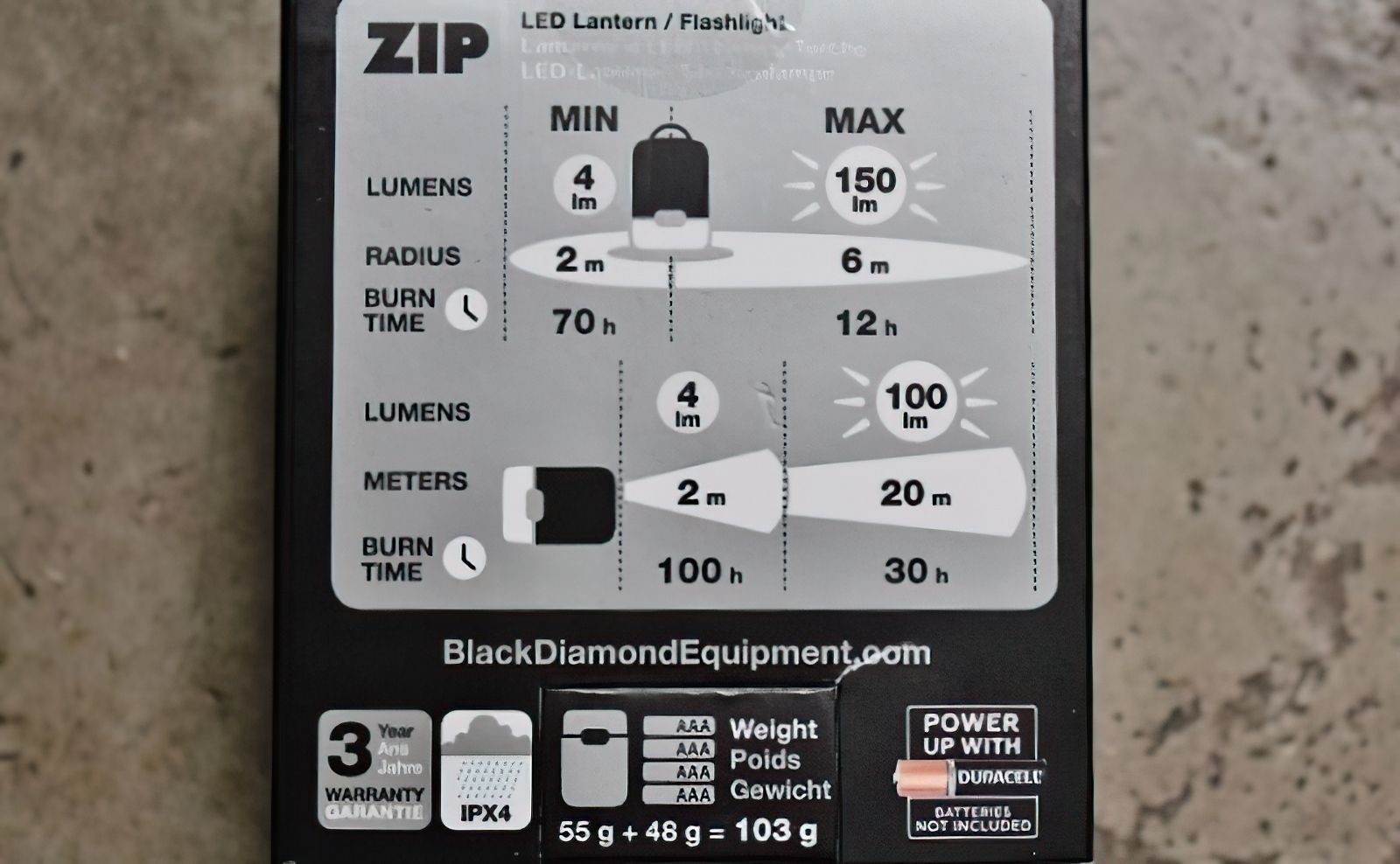 Інноваційна лампа Black Diamond Zip для походів, що поєднує в собі точний промінь ліхтарика до умов освітлення лампи, Zip Lantern виконує подвійну функцію в будь-яку темну ніч у віддаленій місцевості. Поміщений в матову білу кулю, 1 світлодіод забезпечує яскравість ближнього світла в 150 люмен для приготування їжі, сортування екіпіровки або перегляду карти. Коли природа кличе або прийшов час залити воду, режим ліхтарика включає 100 люмен точного променя, щоб освітити шлях. Простий складаний гачок зверху дозволяє легко повісити його на гілку або на шнур.