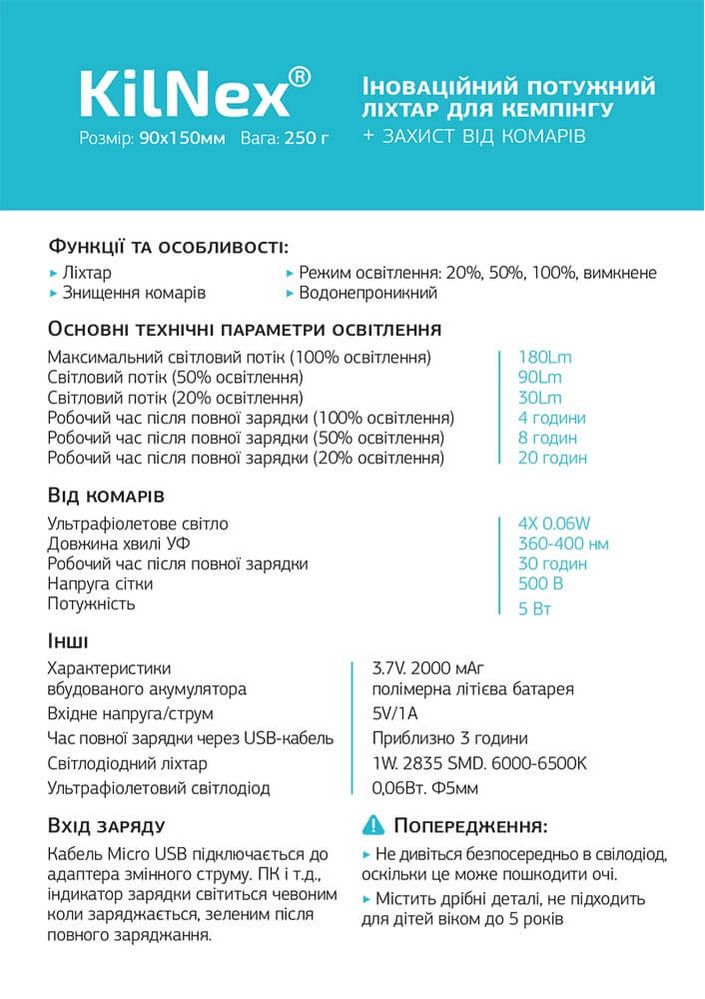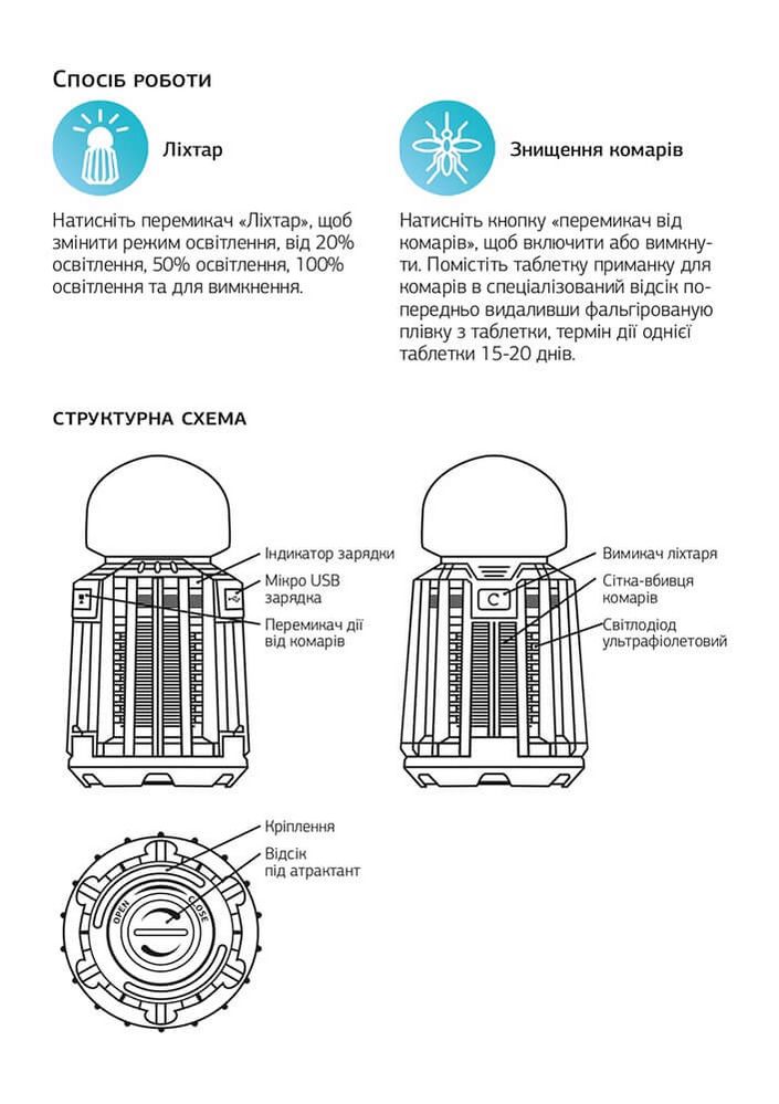 Пристрій екологічно нейтрально, всередину ліхтаря вставляється спеціальна таблетка - приманка імітує запах людини для залучення комах далле використовується ультрафіолетове світло, який також приваблює комах і електричний струм, яким їх вражає, коли вони стосуються металевої решітки. Захистіть свій будинок і двір від літаючих комах.