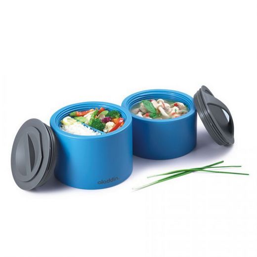 Це набір з двох (0,6 і 0,35 л) ланчбокс Aladdin Bento сполучених між собою пропонує для ваших страв ємність 0,95 літра і дозволяє переносити до трьох блюд одночасно. Ланчбокс для їжі або харчовий термос в рівній мірі підходить для гарячих і холодних страв. Його подвійні стінки з ізоляцією з піни збережуть вміст гарячим або холодним протягом 4-5 годин. Просто додайте в нього свою улюблену страву, поставте його на ніч в холодильник, а на ранок розігрійте в мікрохвильовій печі і ви зможете насолодитися гарячою їжею в обід.