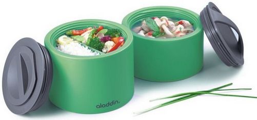 Це набір з двох (0,6 і 0,35 л) ланчбокс Aladdin Bento сполучених між собою пропонує для ваших страв ємність 0,95 літра і дозволяє переносити до трьох блюд одночасно. Ланчбокс для їжі або харчовий термос в рівній мірі підходить для гарячих і холодних страв. Його подвійні стінки з ізоляцією з піни збережуть вміст гарячим або холодним протягом 4-5 годин. Просто додайте в нього свою улюблену страву, поставте його на ніч в холодильник, а на ранок розігрійте в мікрохвильовій печі і ви зможете насолодитися гарячою їжею в обід.
